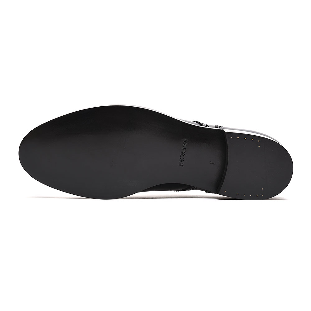 JOE-6のセミブローグダービーをカスタマイズした作品。アッパーレザーは、ZONTAミスティーカーフのネイビーを使いましたが、仕上げに黒染色して黒に近いネイビーになっているのが独特です。トゥキャップのメダリオンは、当店ご提案のものをベースにデザイン。トップラインはパイピング。