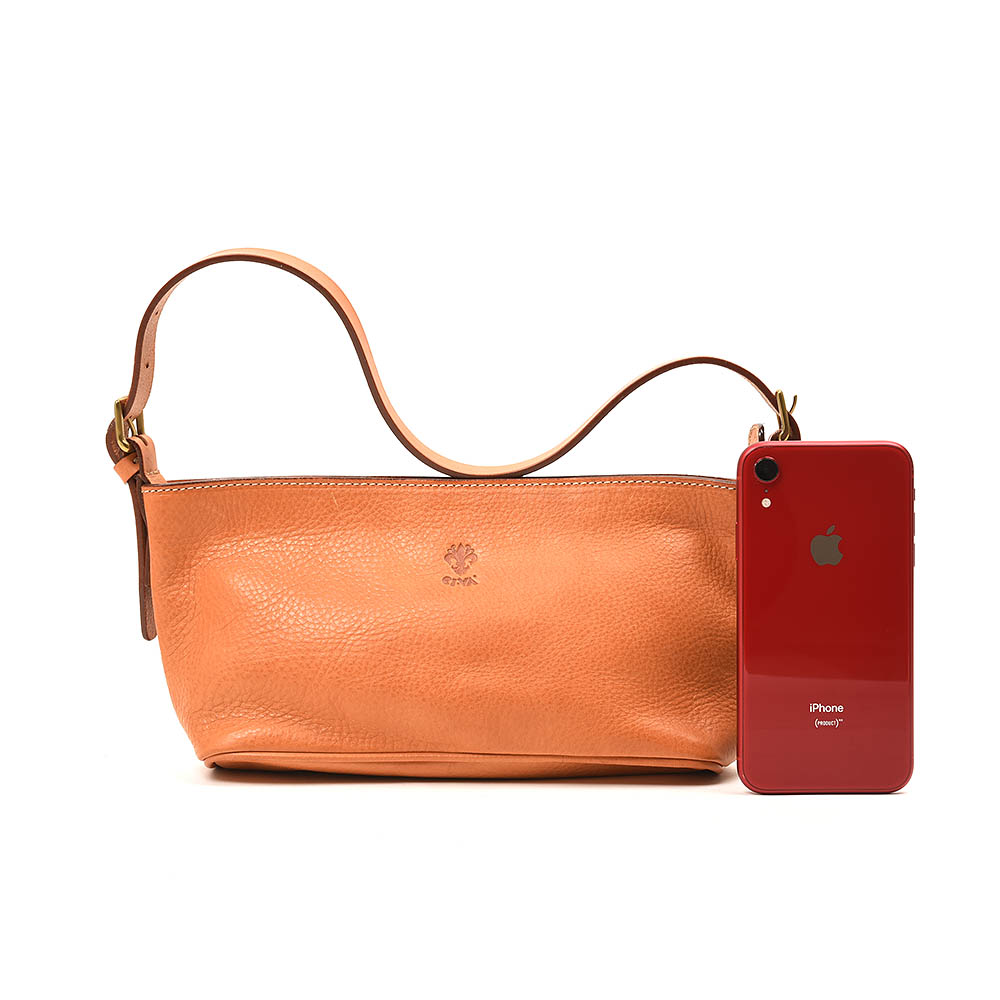入荷 | CI-VA チーバ 1591-7201 ハンドバッグ ナチュラル 2021年01月07日 [チーバのハンドバッグ] イタリアCI-VAのハンドバッグ。ショルダーにもなる長めのストラップハンドルは、長さ調節も可能です。ナチュラル色のPUCCINI ATTALI-O社製植物タンニン鞣しレザーVOLANATOを採用したシボ感の効いた風合い豊かなバッグで、使い込むと色が濃い目に変化して行く特徴があります。コンパクトですので、小脇に抱えても可愛い大きさとデザインです。 イタリアの風合い豊かな革を使用しています ポケットのないシンプル内装 マチもほどほどの厚みです iPhone (6インチ)と比較するとこんな感じです < 前の記事次の記事 >