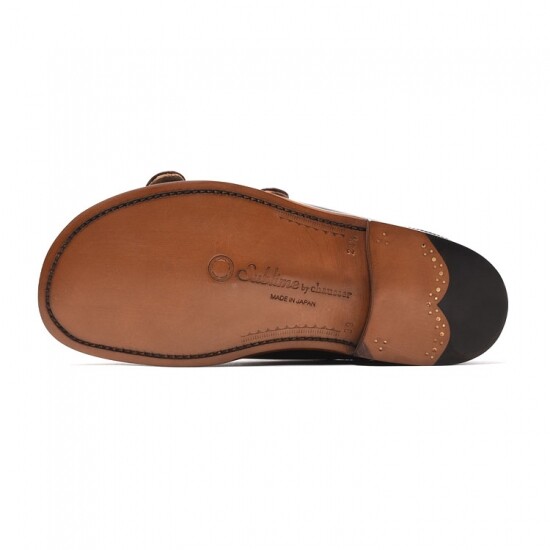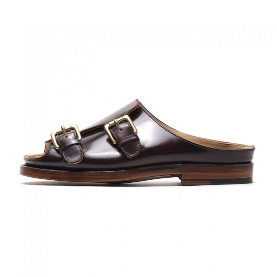 ソール面は、ダブルレザーソールの出し縫いグッドイヤーという超堅牢な作り込みです。ウエスト部分をアール状に削り残したデザインも迫力で心に刺さるオーラが凄いです。入荷早々に購入されたお客様は、『これも履き皺を入れたくなるよねぇ』とシェルコードバンサンダルならではのコメントが溢れました。