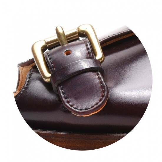 存在感のあるガッシリとした前後真鍮性ローラーバックルも魅力的です。内装は総革張り仕立てで、非常に足当たりの良い革を採用します。毛穴の感じからおそらくピッグかと思うのですが、質感がかなり滑らかで柔らかい肌触りに満足高し!。ソック(踵が乗る部分)は、カーフの同色系バーガンディとしてゴールドの箔押しが高級感を高めています。
