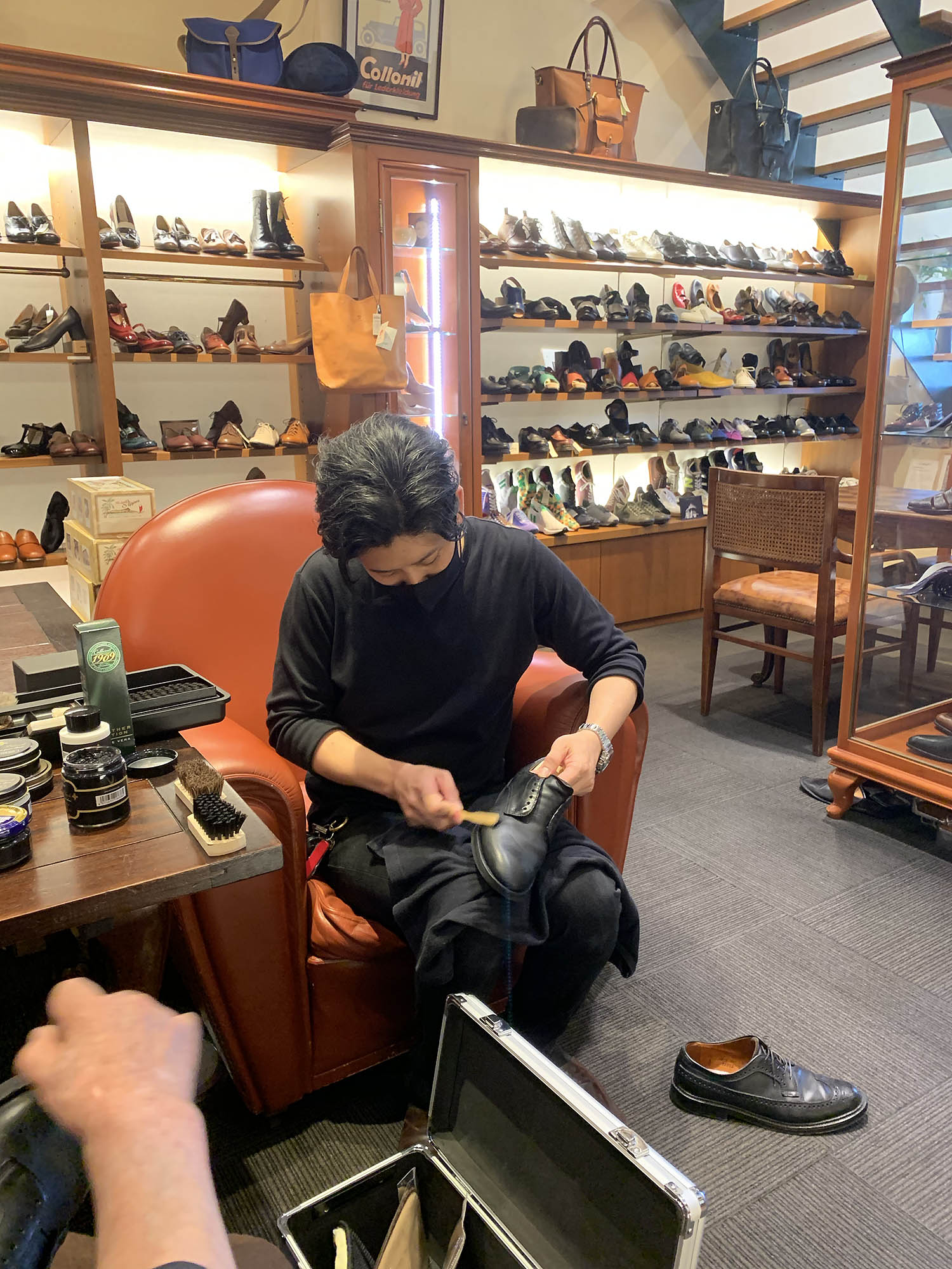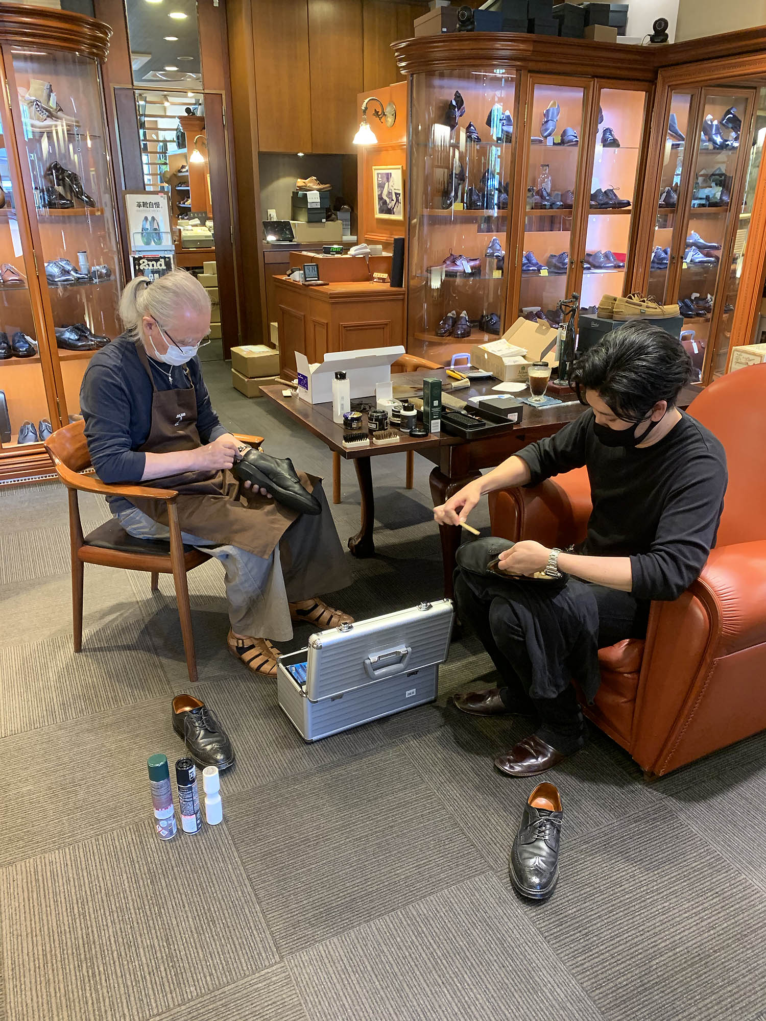 メンテは基本当店お任せで長年来ていたお客さん。一念発起して、自分で磨くべくあらためて磨きの教えを乞うためシューズサロンなとりやへ電話一本。了解、そしたら、持っている道具全部と磨きたい靴を持ってきてねぇと。