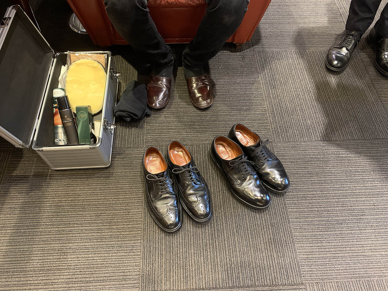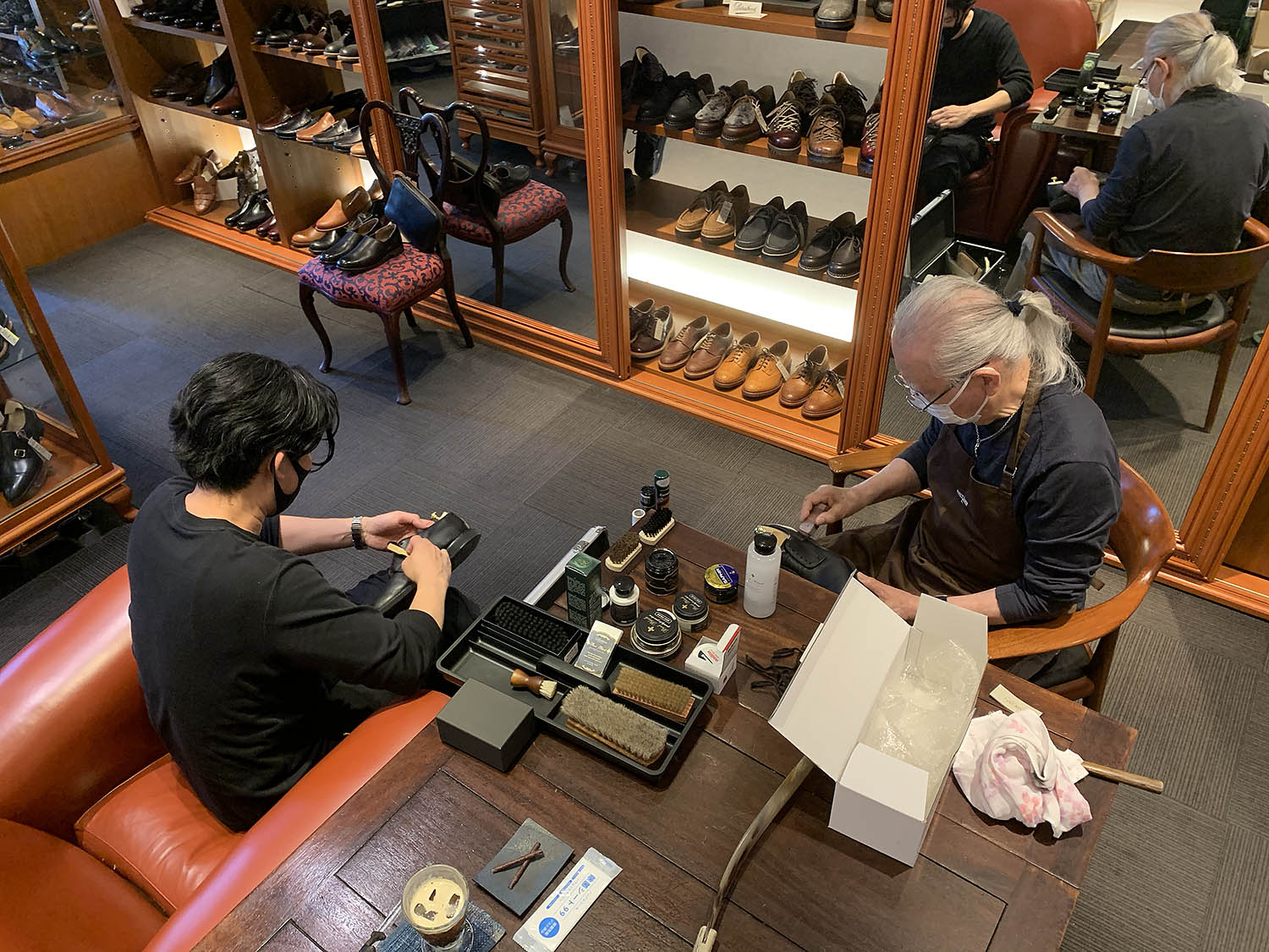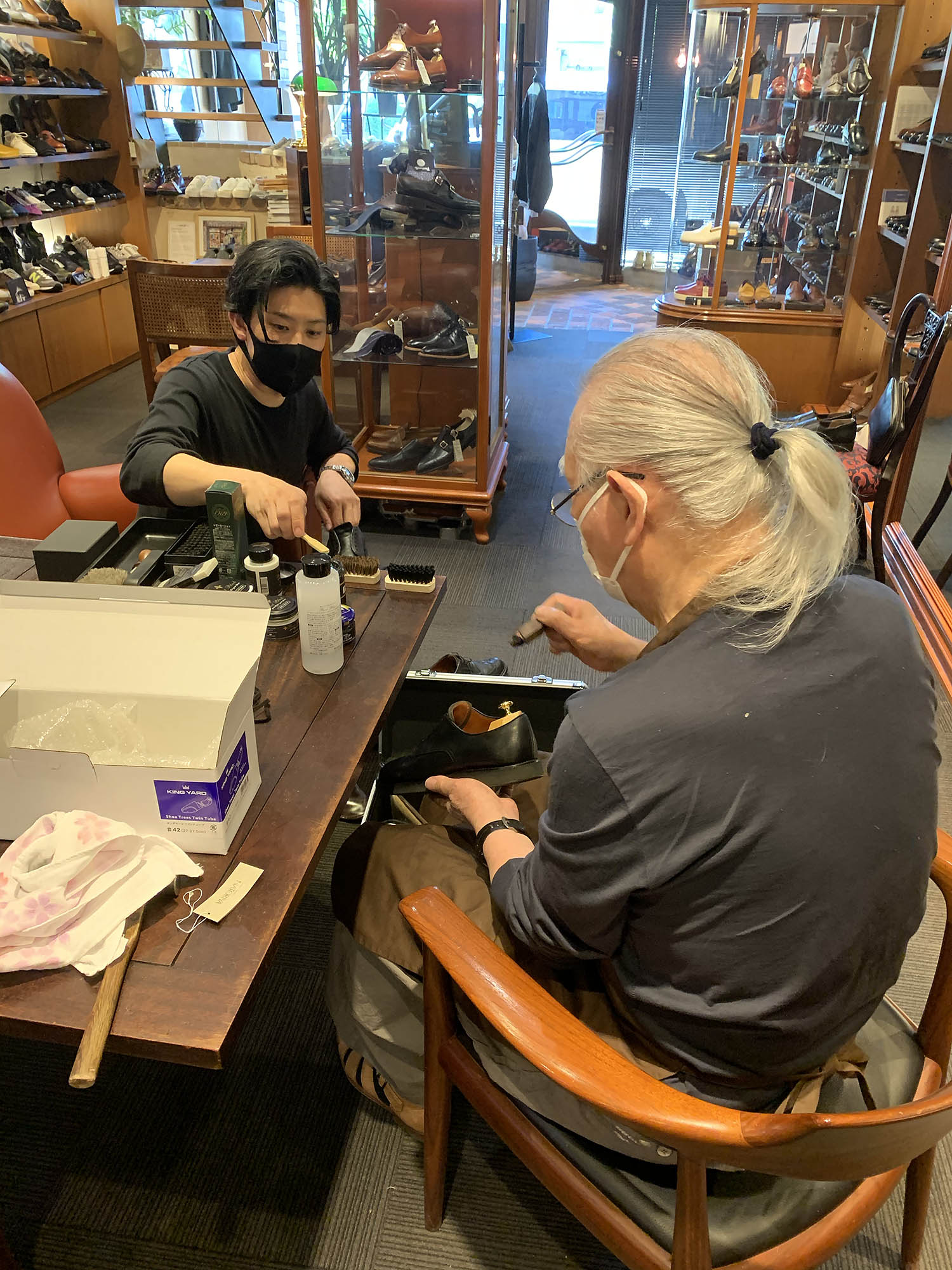 雑談半分、わからないところは質問してもらって、アドバイスする感じで、自分の靴は自分で磨く楽しさを味わってもらうという趣旨!?で進んでいきました。気がつくと、真剣そのもの? 本人も別の世界の職人だからか、こりゃぁ楽しいぜ、うぇーい!なスイッチが入り止まらない様子でした。ハハハ、よきw。