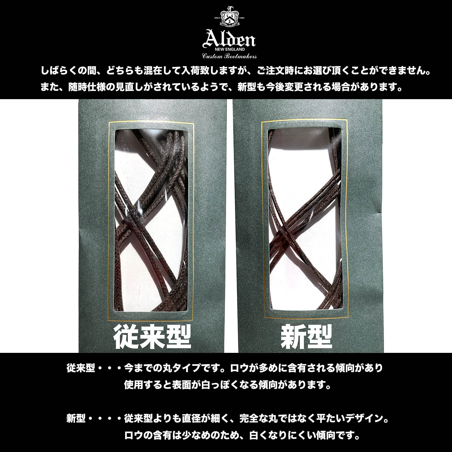 オールデンでは、この新型タイプも76cmロウ引き丸紐として製造販売しているのです。しばらくは、この2種類体勢のまま行く模様です。そこで、お願いになるんですが、1セットずつコントールするだけの人的リソースを確保できません。そして、目もしょぼしょぼです。