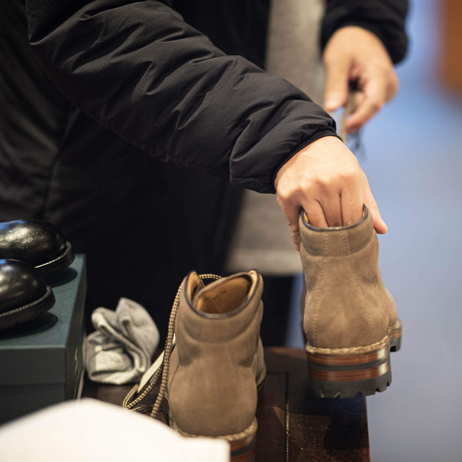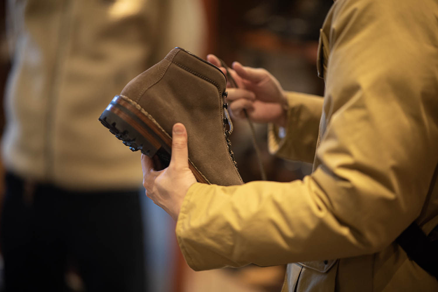 クリスマス。家族へのプレゼントを購入したついでに自分へのご褒美も物色していったマーユーさん。最初にターゲットにしたのは、イタリアの名門フラテッリジャコメッティの登山靴ブランドMarmolada。「このカテゴリーは持っていない」という。FG105という有名なモデルがあるが、ここはよりクラシックなFG583がお好みの模様です。特にスーパーバック・オリーブボールの質感と色が刺さっていて、さらに言えばマルモラーダでは最も深溝のST.MORITZラグソールが堪らなく魅力的に感じているそう。すごく良くわかります(笑)
