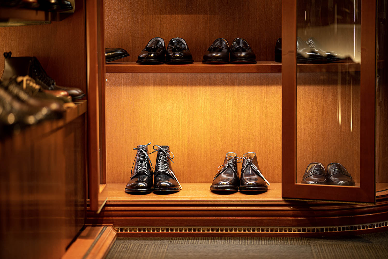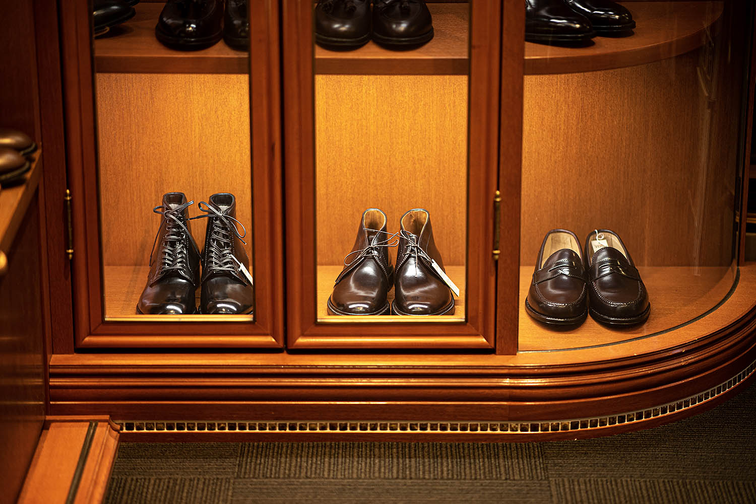 もぅ、見てくださいよ〜、この輝き。凄くないですか? ふっ(笑)磨いてませんよ。堪らんわ〜これ。どうすんの。靴磨く楽しみ奪われたわ〜(笑)いや奪ってくれてありがとうって感じですけどねぇ。オールデンコーナーの扉を開いて、一番下の『輝きの間』に鎮座してやりましたよ。そうしたら余計に光っちゃってもうコ・イ・ツ・ら😊 店舗で実物見てください。「スゲッー」てなりますから。いつもこんなに光ってませんからねぇ。やればできる子達なんですよ。ただまぁ、そこはアメリカ人じゃないですか。気分で変わりますからね。次もそうだとは限らない。またいつものように戻ったらひたすら磨くだけですけどね。それもまた楽しいひとときってもんですよ。