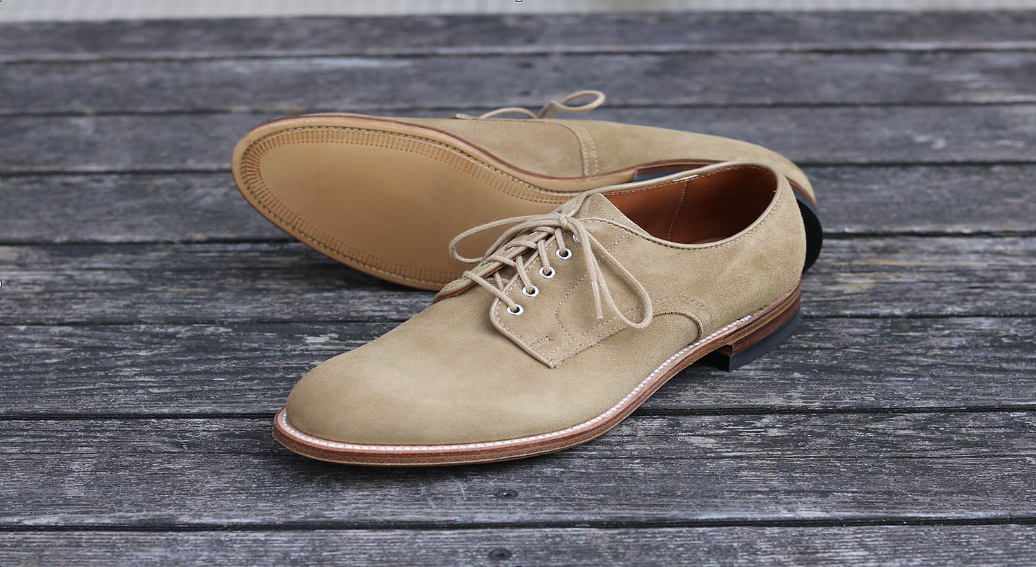 木型はモディファイドラスト。デザインは、P-TOE with NICKEL EYELET。素材はスウェードで色はTANというベージュ色です。シングルレザーソールで、心地よく快適にお履き頂けることは、想像に難くありませんね! 吸い付く様なフィット感としなやかな屈曲性。通気性のよいソール。ドレッシーな木型をカジュアルな雰囲気に上手くまとめあげた快心のモデルです。履けるのが待ち遠しいなぁ。
