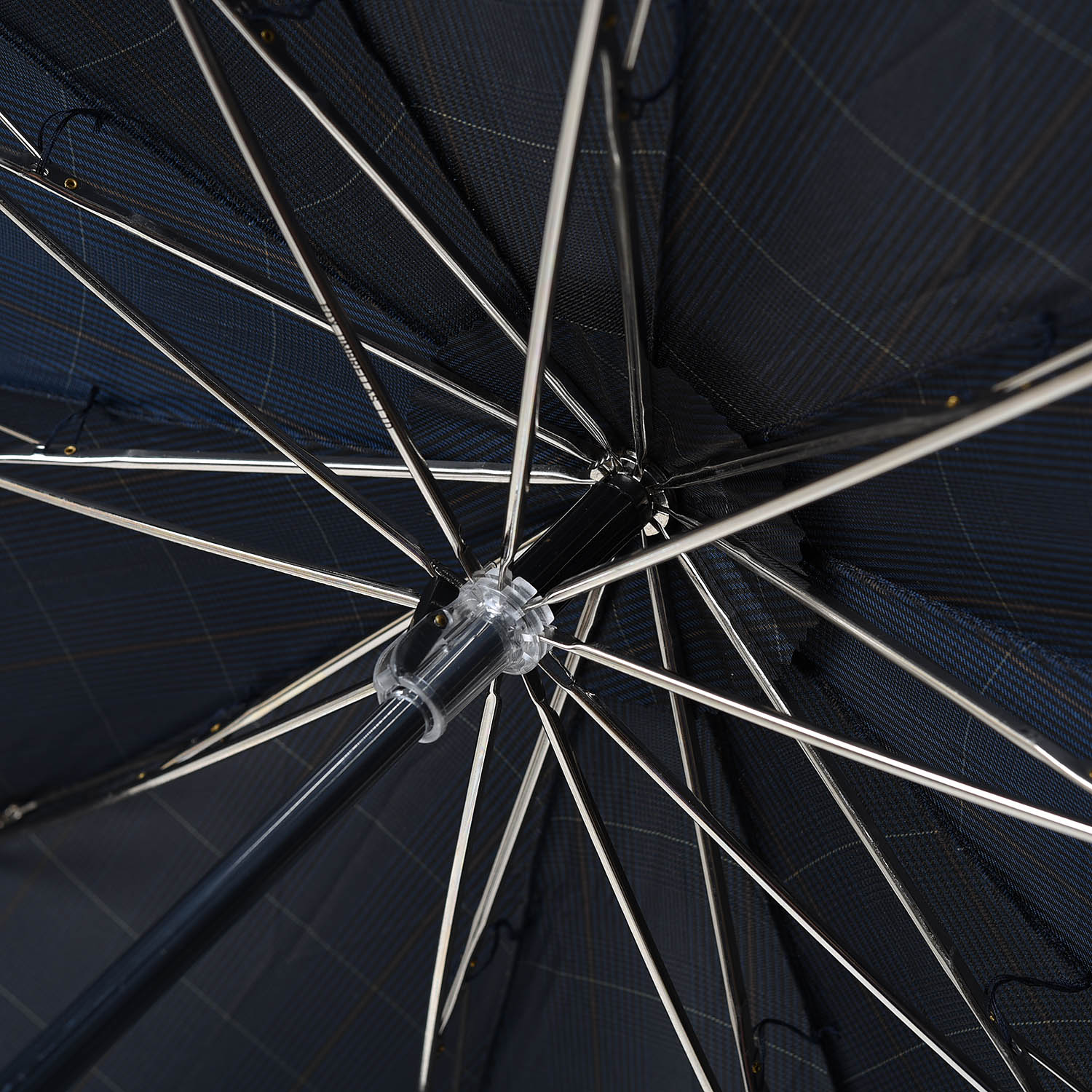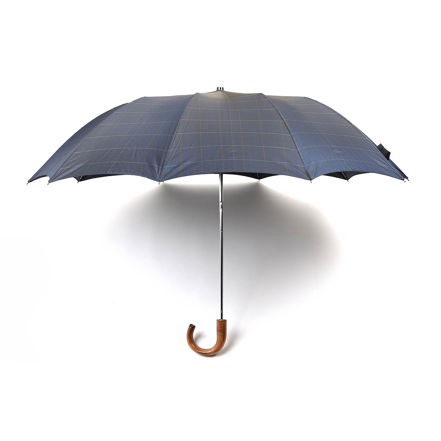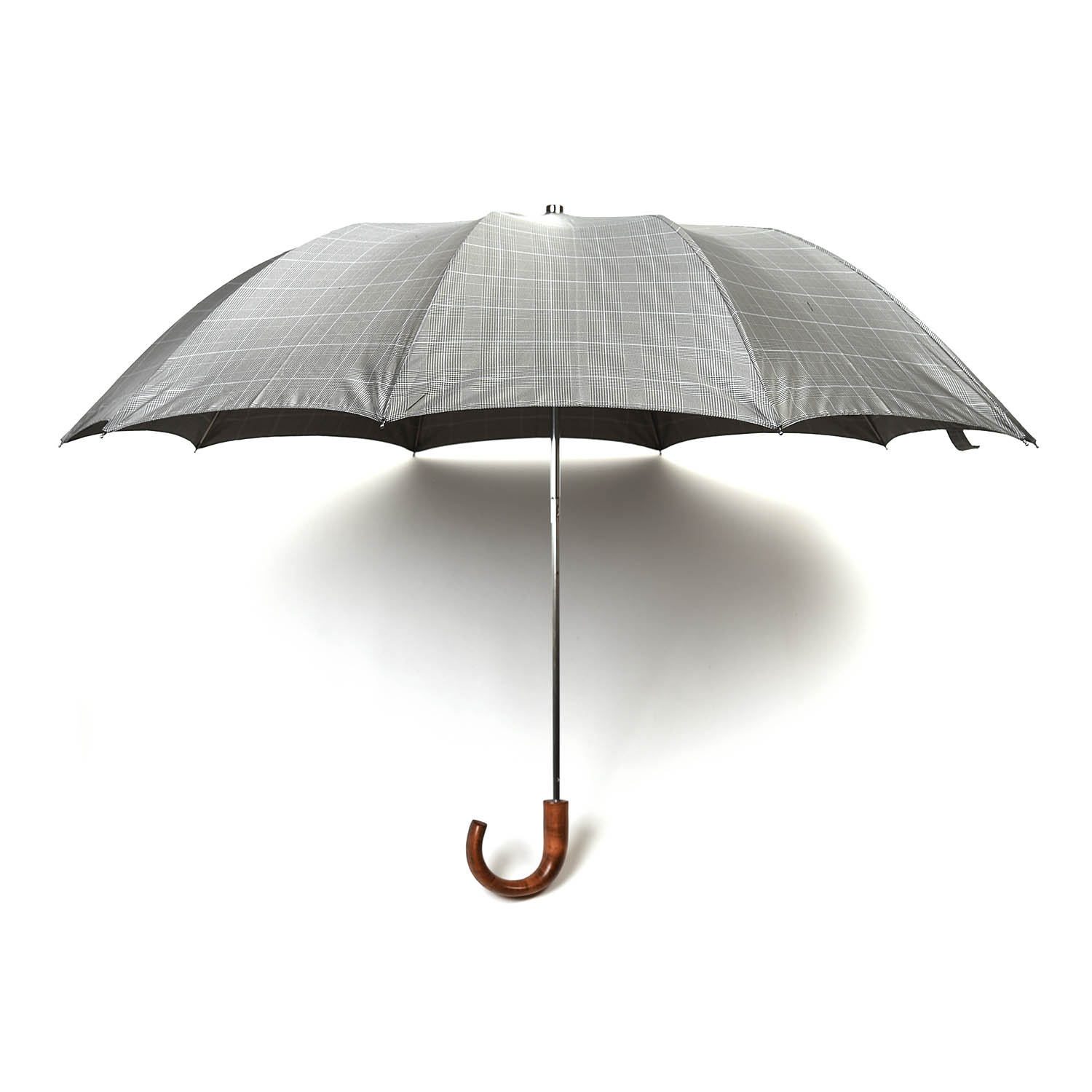 そして、傘地は「プリンス・オブ・ウェールズ」です。イギリスのウインザー公爵が、プリンス・オブ・ウェールズ時代にこの柄を好んで着用スーツの柄が起源です。実に長い歴史を持つ伝統的なブリティッシュスタイルのチェック。男女問わずカントリーな雰囲気にも合わせやすいパターンです。色は、2色展開でグレーとネイビーをご用意しました。それぞれ、開いた時の模様の入り方や近寄って見たときの色合いが異なるので、じっくりご検討ください。どちらを選んでも失敗はありません。間違いのない色だけを選出しました!