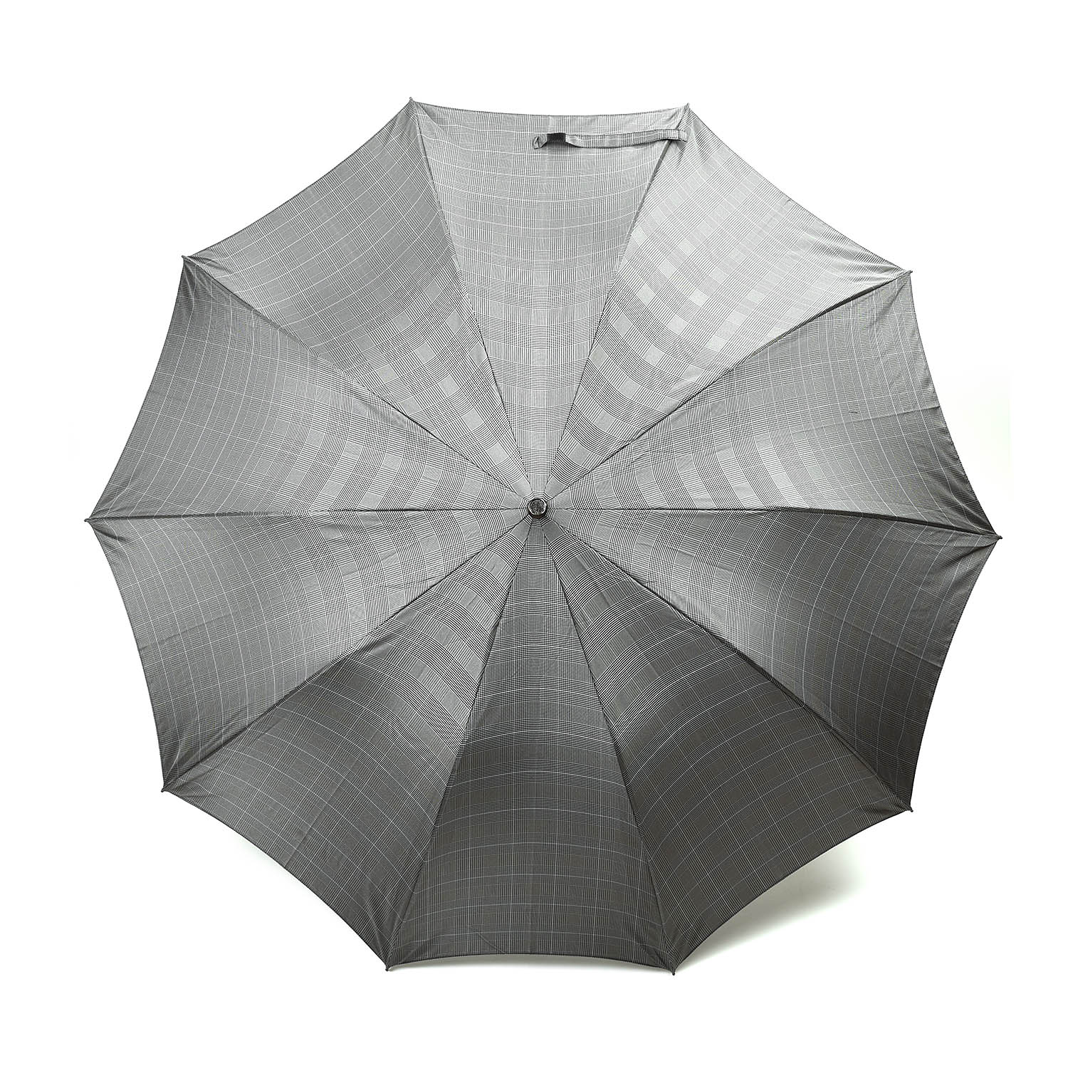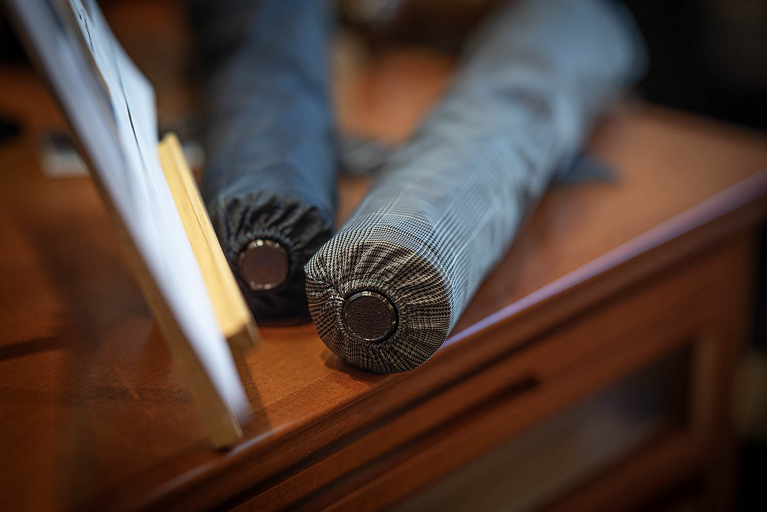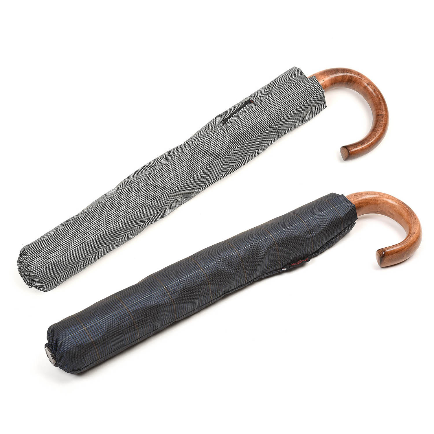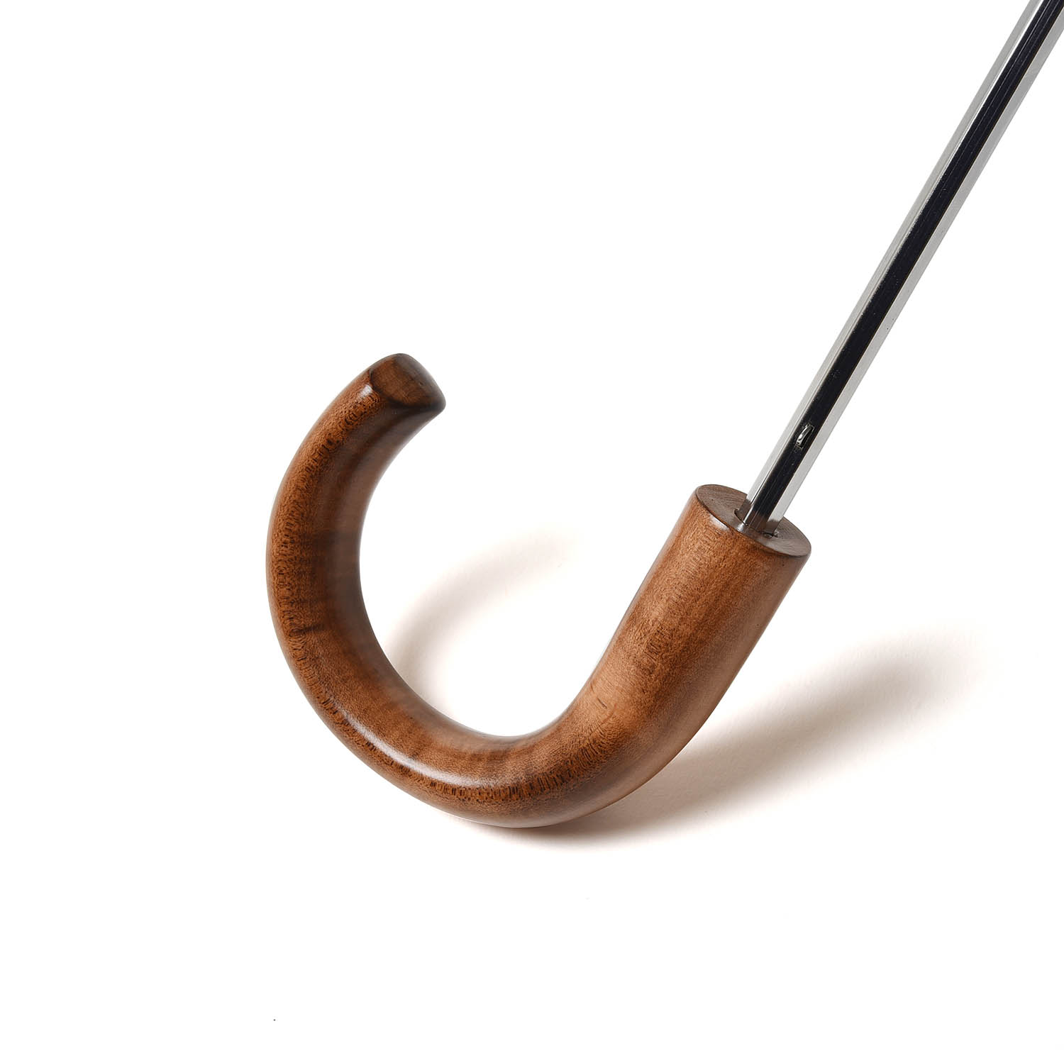 そして、傘地は「プリンス・オブ・ウェールズ」です。イギリスのウインザー公爵が、プリンス・オブ・ウェールズ時代にこの柄を好んで着用スーツの柄が起源です。実に長い歴史を持つ伝統的なブリティッシュスタイルのチェック。男女問わずカントリーな雰囲気にも合わせやすいパターンです。色は、2色展開でグレーとネイビーをご用意しました。それぞれ、開いた時の模様の入り方や近寄って見たときの色合いが異なるので、じっくりご検討ください。どちらを選んでも失敗はありません。間違いのない色だけを選出しました!