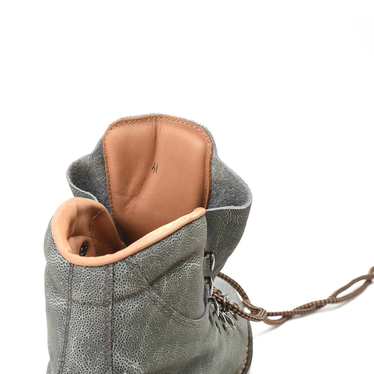 内装もフルレザーという贅沢な作り込み。シュータン裏には肉厚なクッションパッドが入っていて、気持ちよく甲から足首にかけてフィットする設計です。トレッキングブーツということで、ソックスは、できるだけ厚地のものを履くことをお勧めします。雰囲気もでますし、このブーツの目指している履き心地を実感できるでしょう。(もちろん薄手ソックスでも履けますが、少しゆとりが出るのでインソール追加がおスメです)