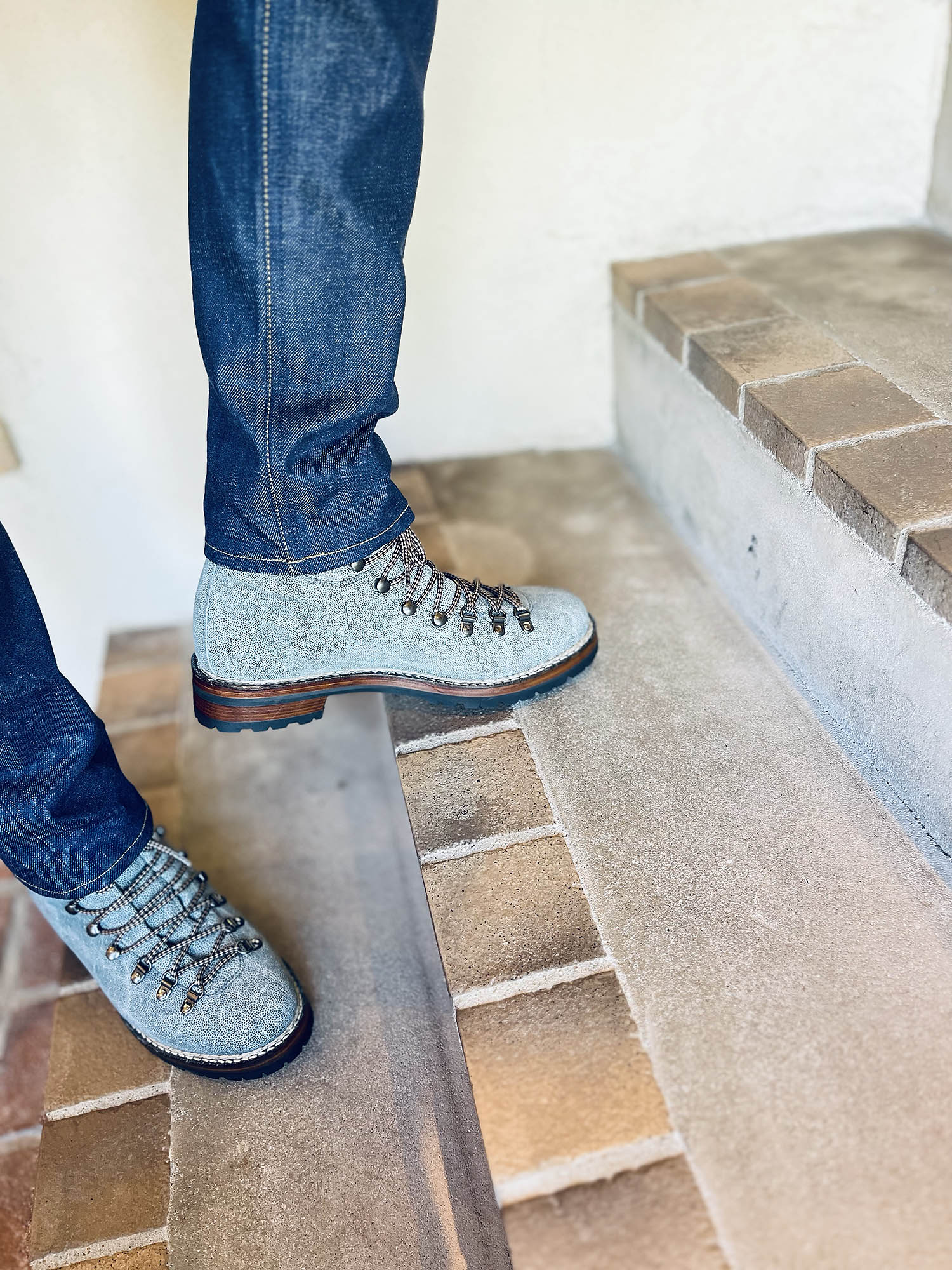 履いた時の雰囲気はこんな感じ。革色がナチュラルグレーのGrigio(グリッヂオ)というほぼ無垢な状態のグレー色です。ほんのりブルーが買ってみえるのも特徴のひとつです。めちゃめちゃ雰囲気があるでしょう? 価格も凄いですが、他には無いこの存在感、しかも希少種であることを鑑みると、実はそんなに高いものではないと理解できると思います。