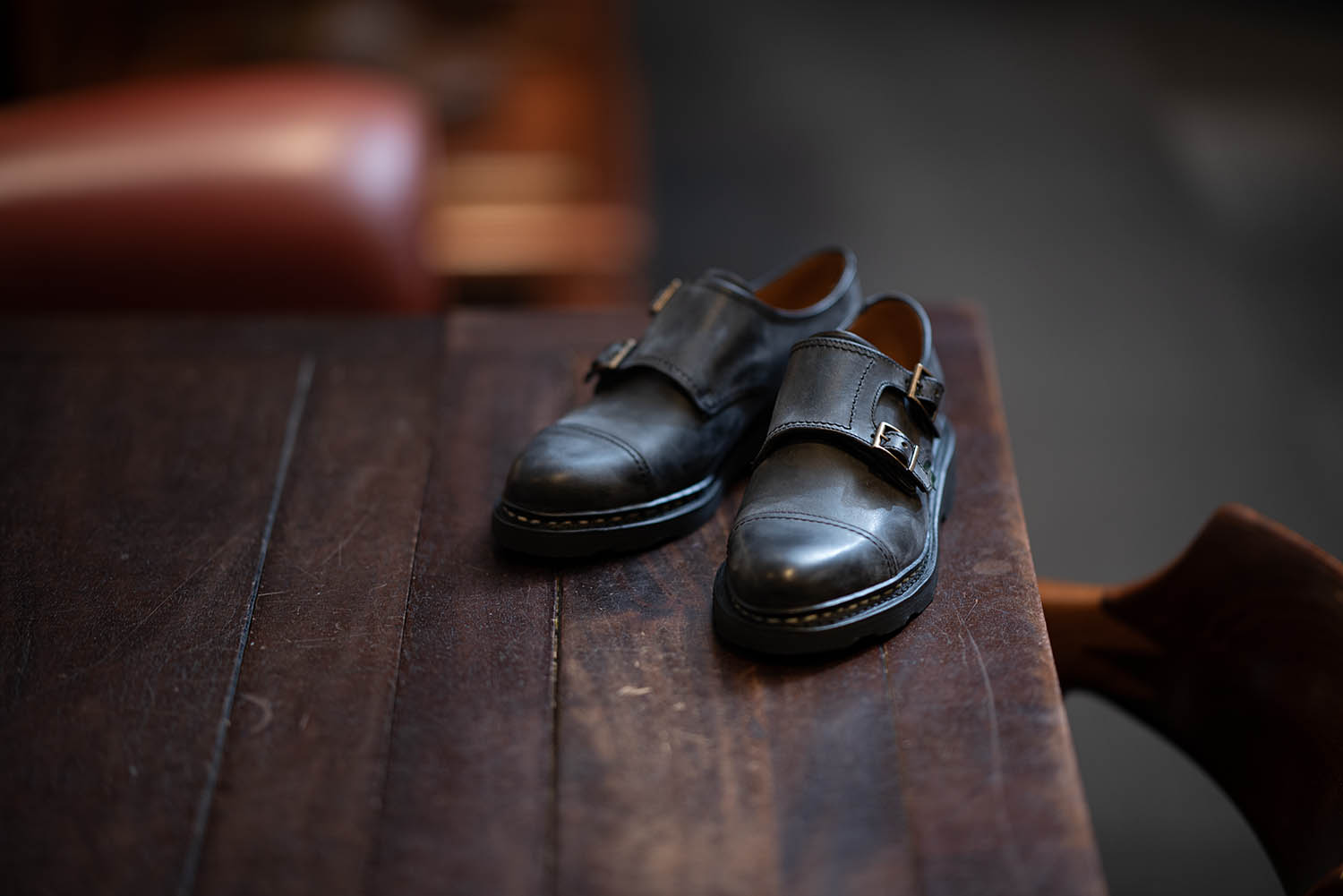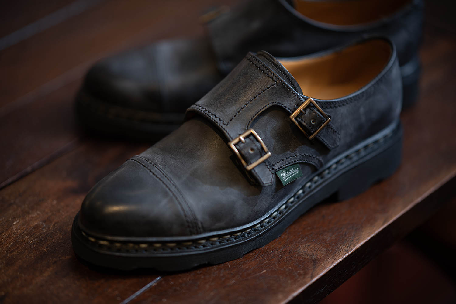 印象的で調和ももたらしてくれるダブルモンクストラップシューズ。Paraboot社のレディースモデル「VOGUE」です。メンズのWiliamにそっくりですが、呼び名は異なります。ノルウィージャン製法はそのままにGRIFF II (天然パラゴムソール)を装着してあります。この季節はブルームもたっぷりと現れて、熟した採れたて葡萄のような佇まいが楽しめます。これは、寒さで革内部のパラフィンが硬化することで、革表面を白い雲のように覆うものを言います。パラブーツならではの風物詩。