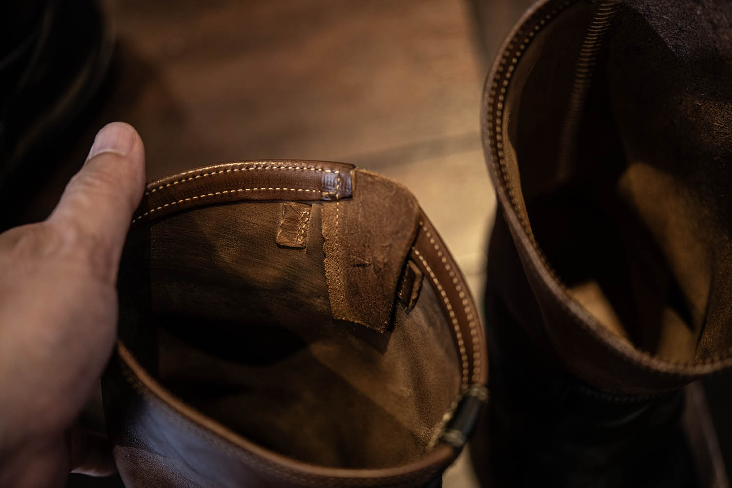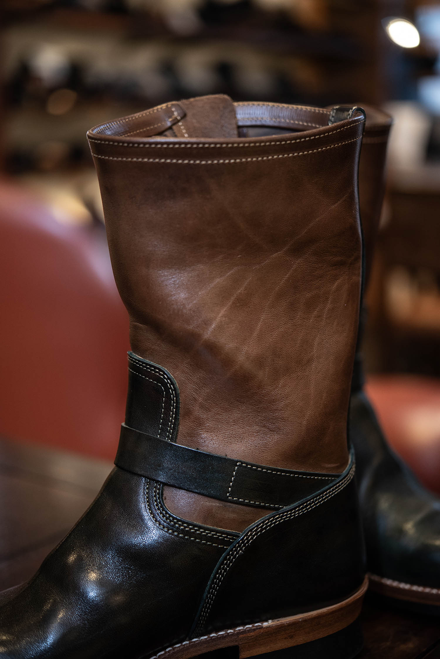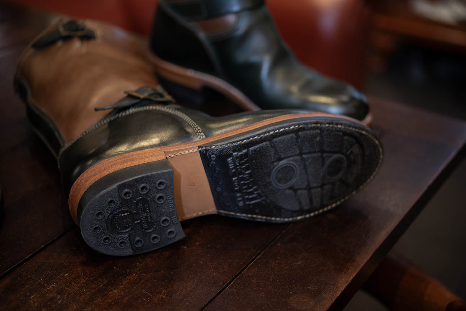 本底は、ビルトライト製のビンテージソール&ヒールが使えた時代なのかぁ。なんて羨ましい。それにしてもいいエイジングを見せてくれる。さすがMOTORだなぁと、心から感心しました。うちの在庫のブラックもトラが入っているし、茶芯もうっすら出ているので、履き込めば間違いないいい味がでるに決まっています。数年で、ものすごいバケるブーツだと思う。