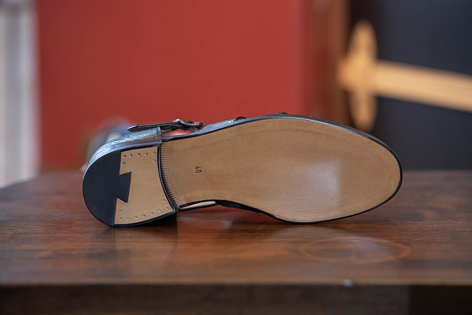 ソール面はシングルレザーソールで伏せ縫という超面倒で手間の掛かる製法を取っています。たぶんデザイン的に縫い糸を出したくなかったんだと思います。その方が美しく高級感があり、履いた時のフィーリングも良いから。ただ、日本国内で履くとなるとちょっと様子が変わります。レザーソールのメリットとしては通気性の良さ、屈曲性などが挙げられます。しかし、濡れた路面や荒れた路面には弱いです。これは革だから仕方がありません。でも、最近の日本は都会でも割と雨も多く、午前中は晴れていたのになぁってこともあります。また、駅構内やビルなどの硬い床だと滑ったりして、アブなって思ったこともあるでしょう。