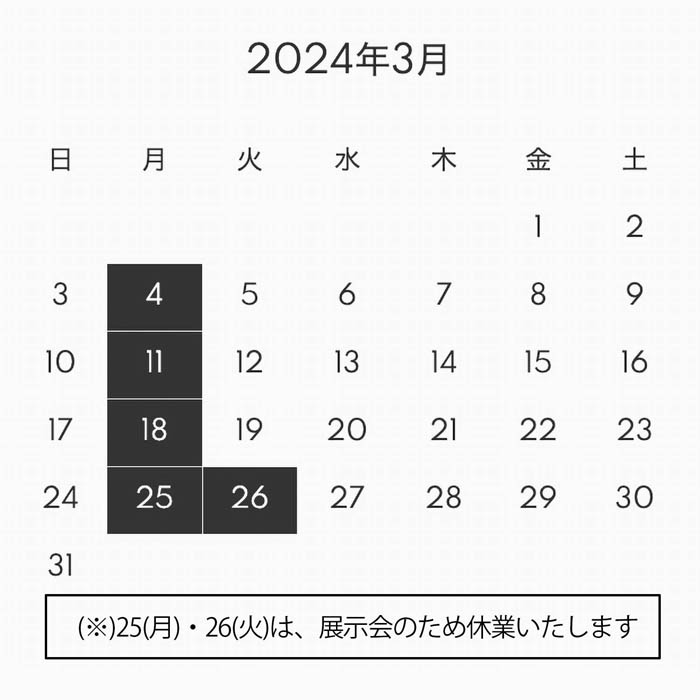 25(月)・26(火)は連休します 2024年03月20日 3月25日(月)・26日(火)は、連休させて頂きます。 ─────────────────────── ・実店舗=休業します ・通販=出荷はありません ─────────────────────── < 前の記事次の記事 > コメント コメントフォーム 名前 コメント 記事の評価 リセット リセット 顔 星 情報を記憶 コメントを投稿する