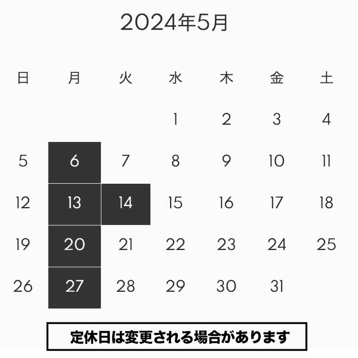 5月の定休日です。 2024年05月01日 連休最終日の5月6日は、(月)のためお休みです。 < 前の記事次の記事 > コメント コメントフォーム 名前 コメント 記事の評価 リセット リセット 顔 星 情報を記憶 コメントを投稿する