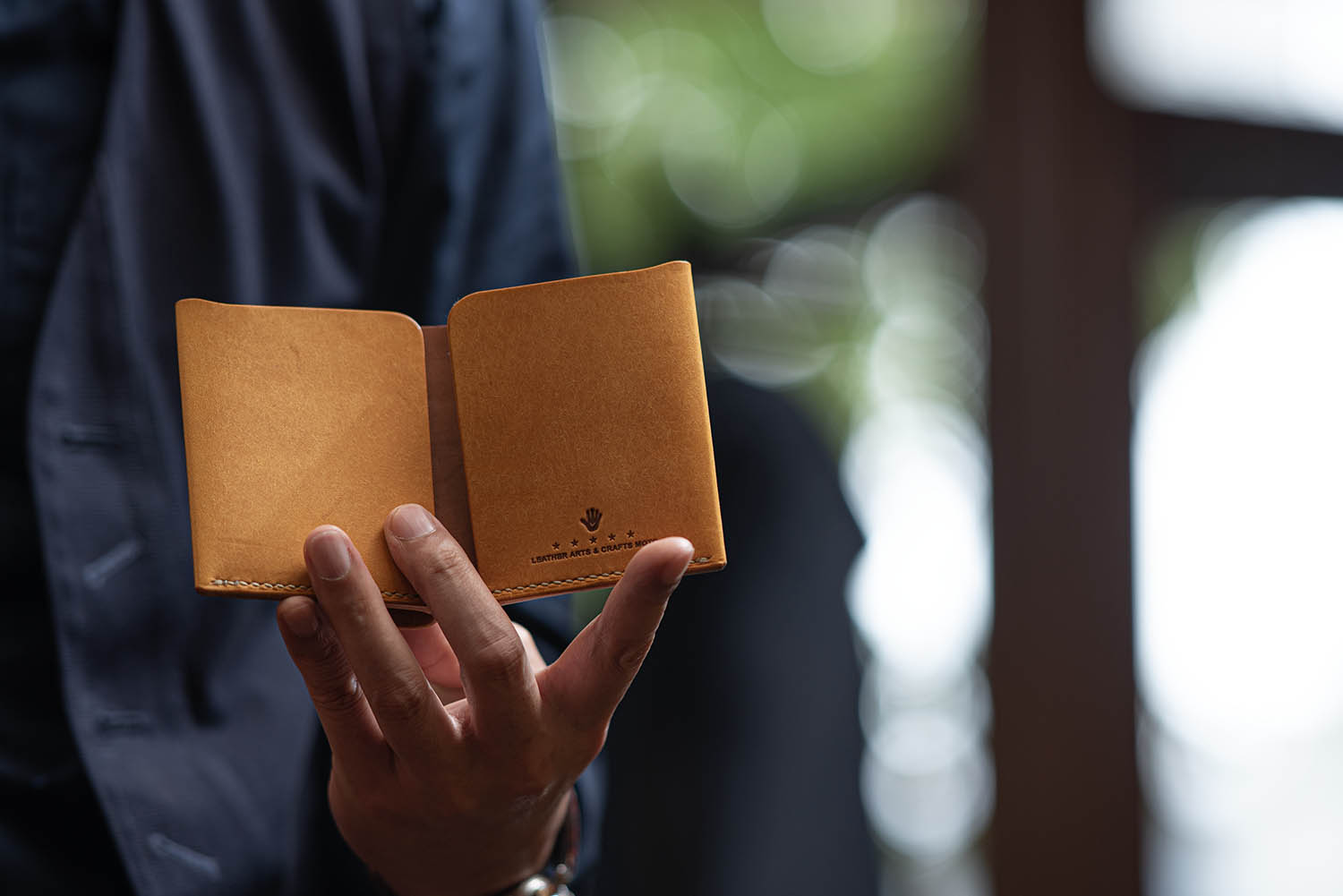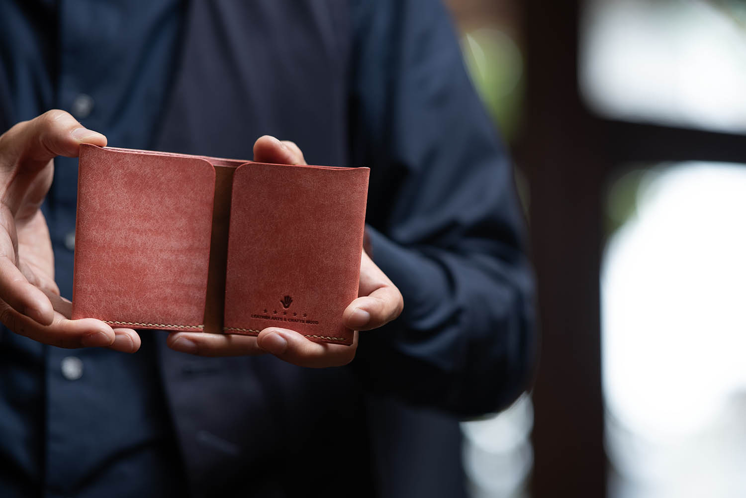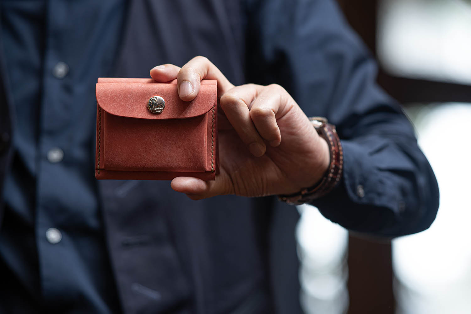 こちらはW9RのMOTO二つ折り財布。全体がラフバケッタレザーを使用したものです。触り心地がとても良い。和紙って感じの質感。・・・なんですが、使い続けてる脂が入っていって、革表面の毛羽立ちが抑えられてオイリーな艶感、そして濃度が増してものすごい成長を遂げる革です。変化が楽しい!! ゆっくり変化させるなら、これを巾着か箱に入れて持ち歩くといいかも(笑) そこまでしないかっ! でも長く変化の様子を楽しむならそれもアリかもねぇ。