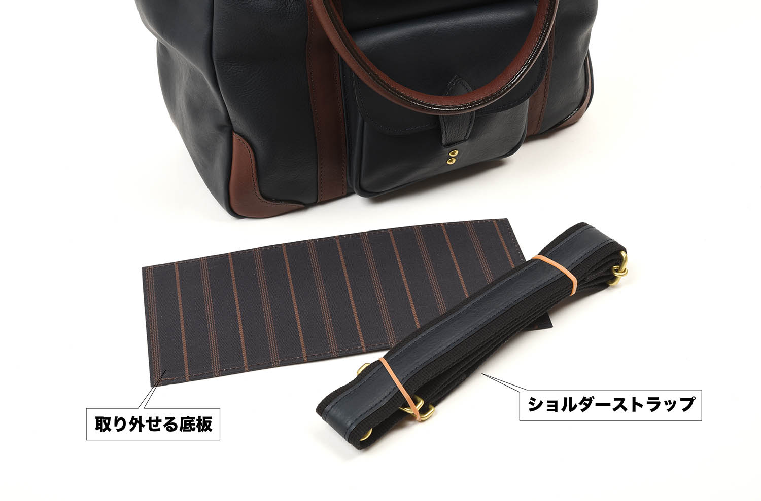 ハンドルやトリムはダークブラウンのレザー製。取り外しの効くショルダーストラップは、革とコットンを組み合わせた素材です。以前ストラップのどちらの面を使うのかというご質問があったのですが、コットン面が洋服側になります。また、今回から底板を取り外しできるようにしてあります。まぁほんど外すこともないでしょうけれど、パソコンなどを入れた時の不安解消用に作って貰いました。ちなみに金属の足が5本あるので、直接ダメージを被る心配は少ないです。