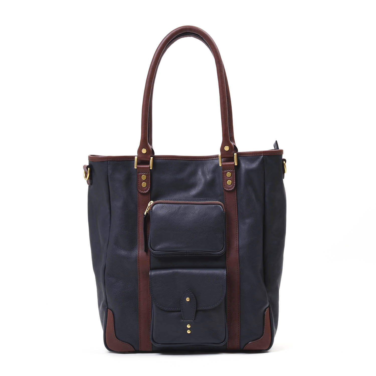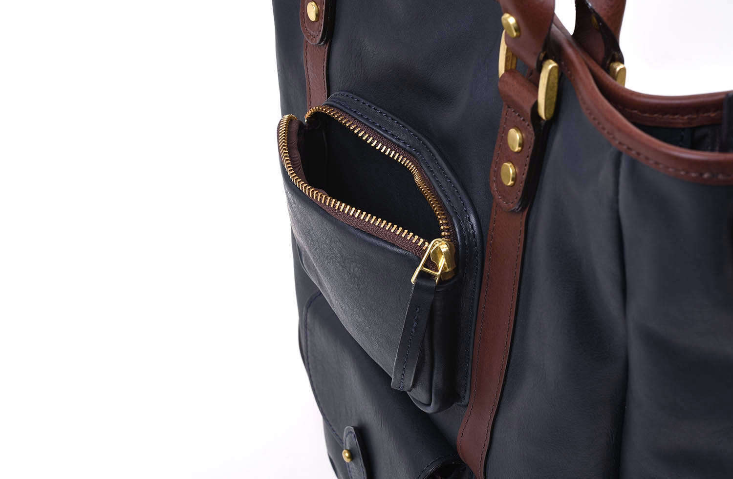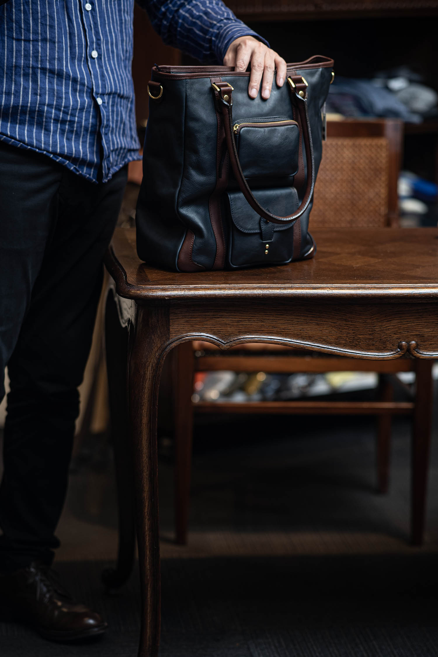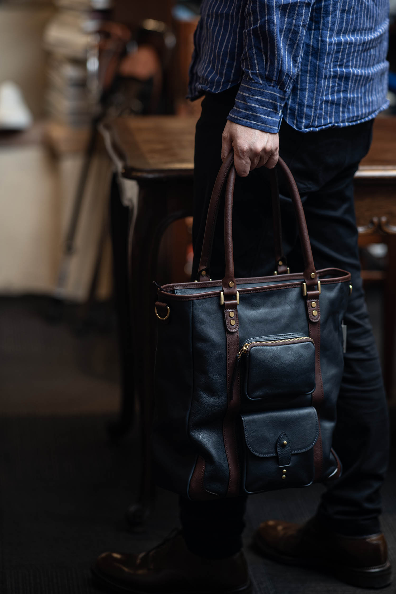 そんなC-635 バッグは、これまでいくつかカラー別注をお願いして参りましたが、今回は「ミッドナイト×ダークブラウン」でオーダーしたものが出来上がりました。前回ブラック×ダークブラウンをやっていて、人気のうちに完売しましたが、写真だとあれに酷似した配色ですね。でも、黒ではなくミッドナイト(濃紺色)です。