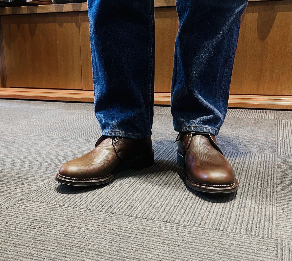 本日の目的の靴は、カナダの逸品VIBERGから最近入荷したばかりのUplands。ハイエンドチャッカブーツとしてご紹介した名品です。ぜひともみ現物を見て決めたいということで、ご来店くださいました。ただ、事前のご連絡はなかったので、万が一売れていたら諦めて別の靴(ジャコメッティのコンビネーションチロリアンFG318-002)か、それも売れてなくなっていても、絶対何か買って帰る! と不退転の決意?で新潟県まで来て下さました(笑) 嬉しいです! ありがとうございます!