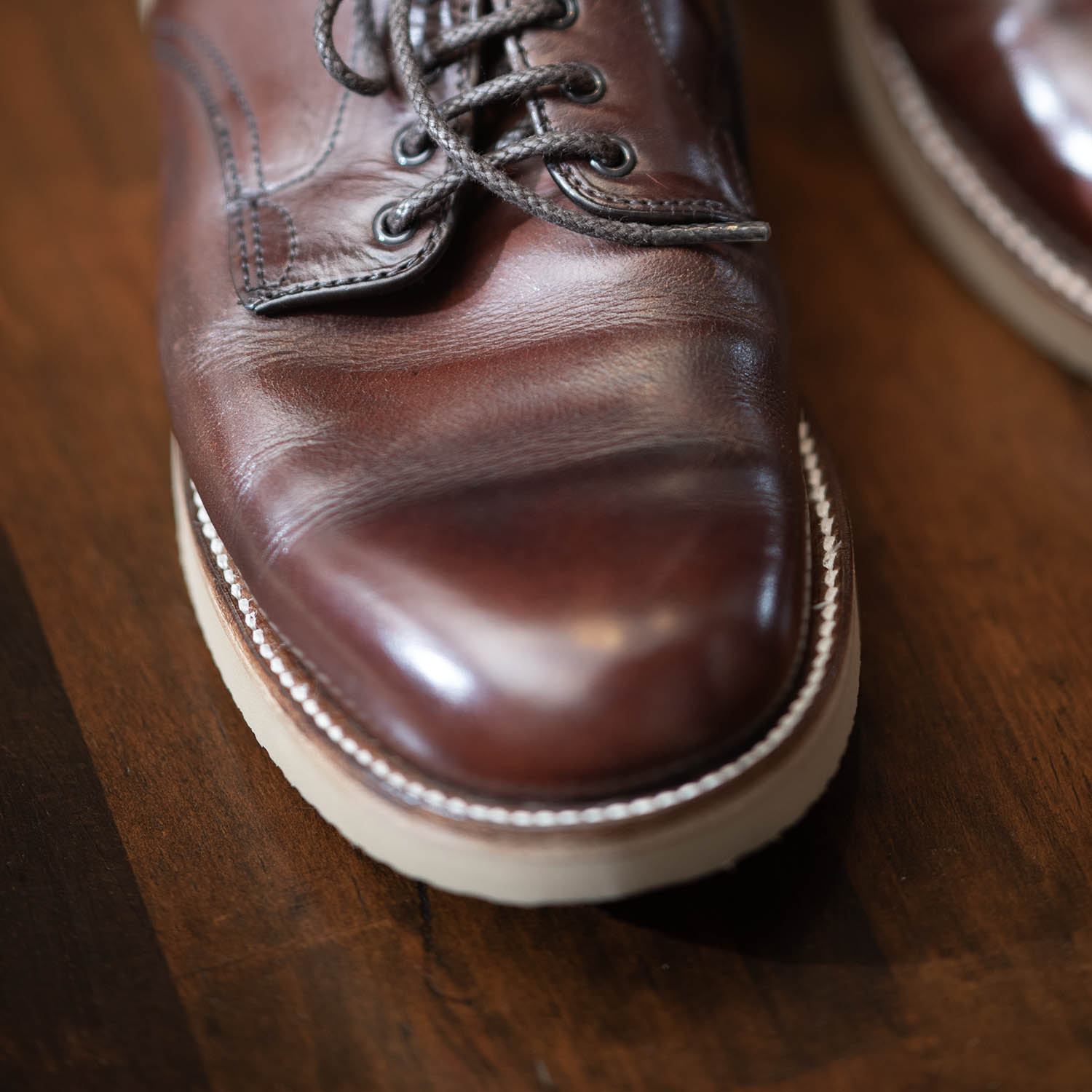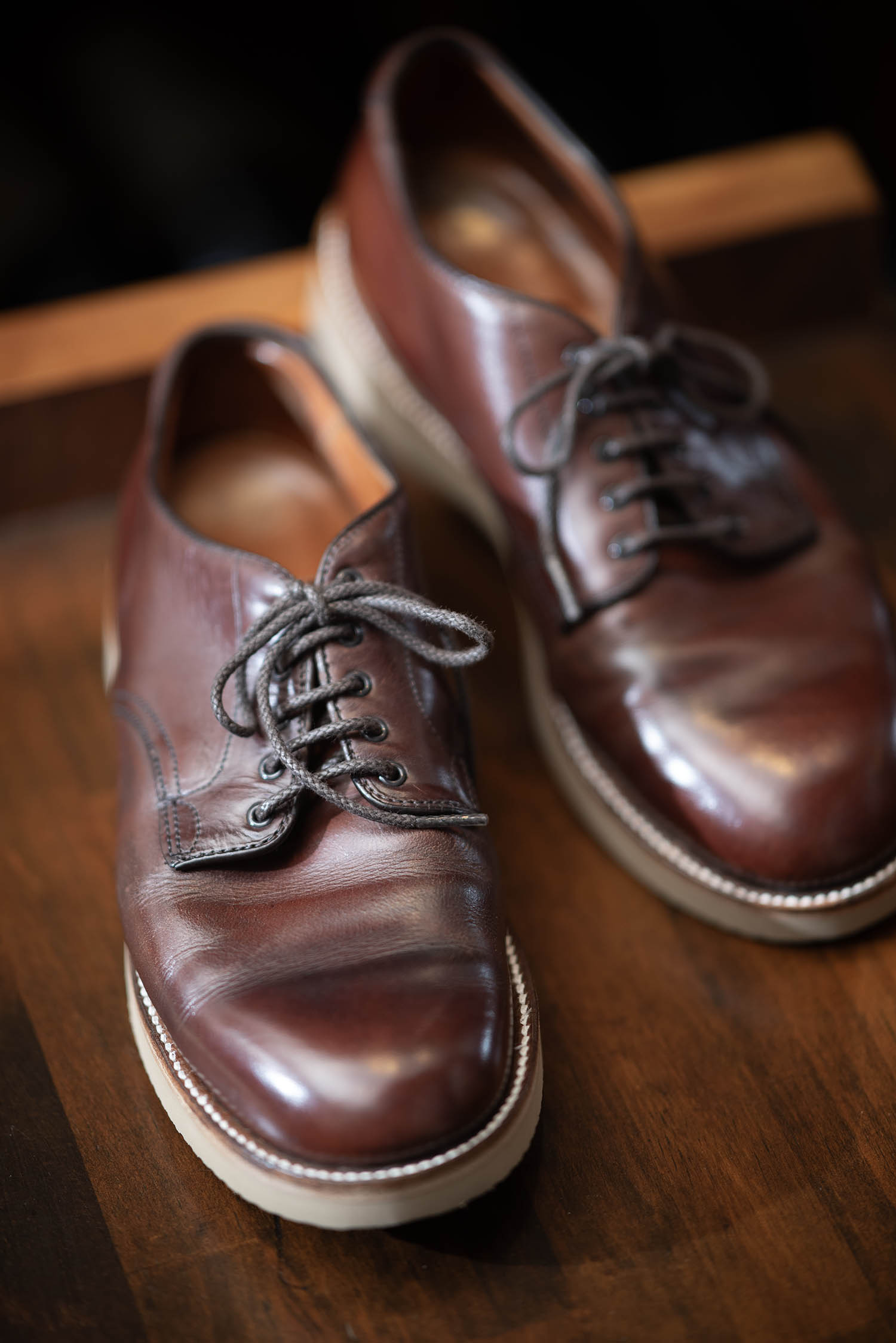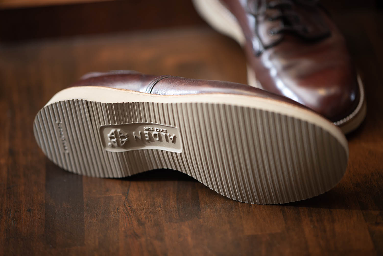 実はこのモデル、先日ご紹介したMOTORATORYのお客様の靴で、ASEAN地域で活躍してきたオールデンです。あちこちに入った歴戦の傷が、タフな環境での使用状況を物語ってくれます。それでも、さすがはホーウィン社製クロムエクセルです! 傷はあっても機能性はそのまま。メンテされていたと思いますが、革本来の持ち味が発揮されているのが分かります。