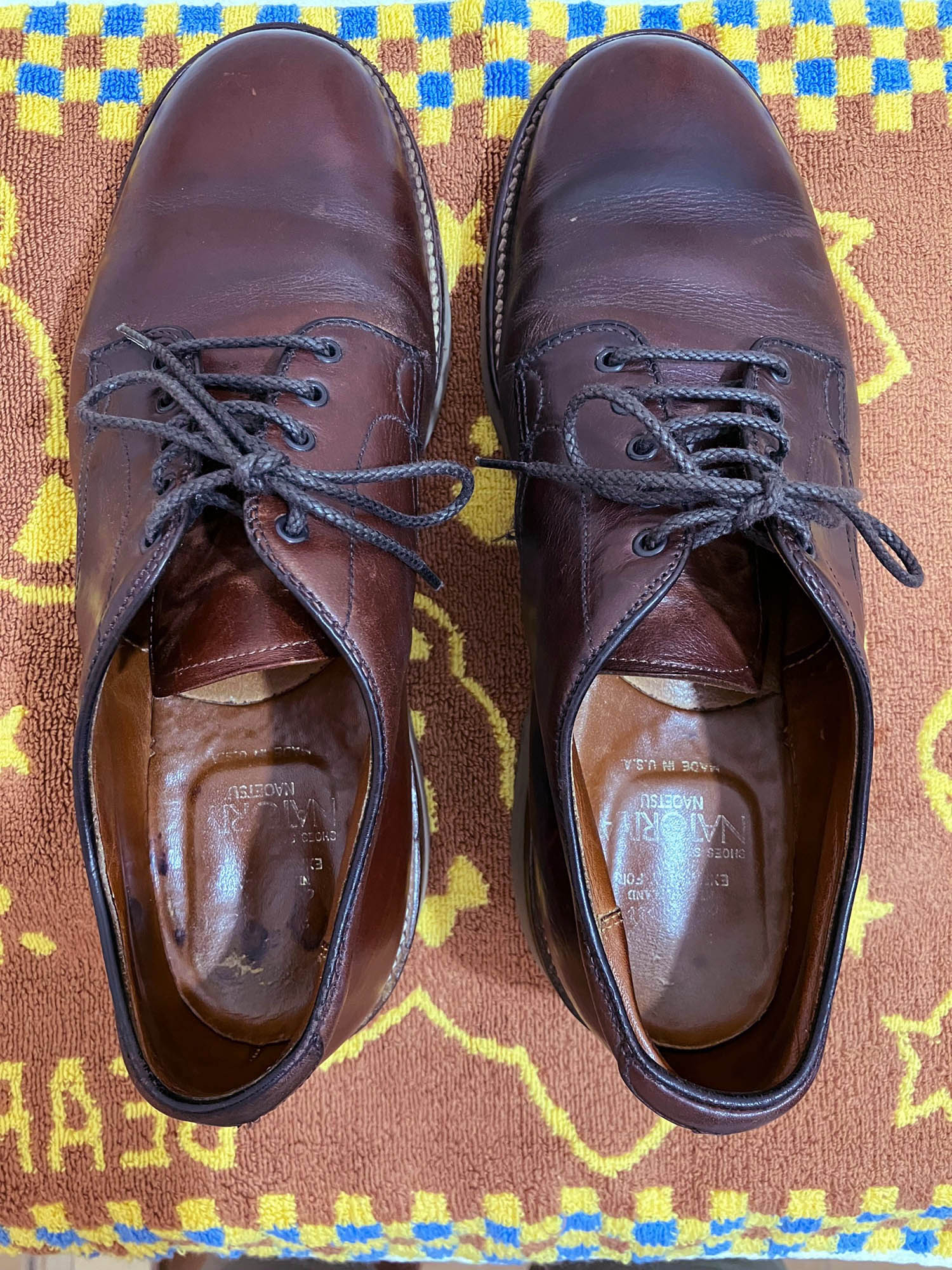 約10年前にお求め頂いた当店別注オールデンシリーズの一つで、ミリタリーラスト仕様プレーントゥダービーです。革はクロムエクセルブラウン。スーパーラストソールを持つアメリカンカジュアルな顔の革靴です。もともとレザーソールモデルのサービスシューズが存在していますが、ソールをチェンジすることで使いやすくしたアイテムでした。(久しぶりに見たら復刻したくなってきた!)