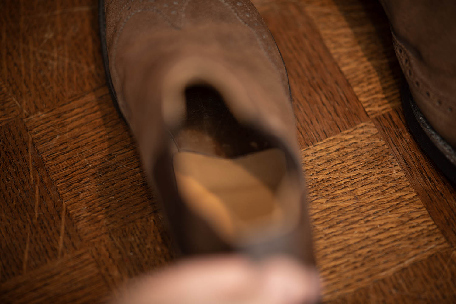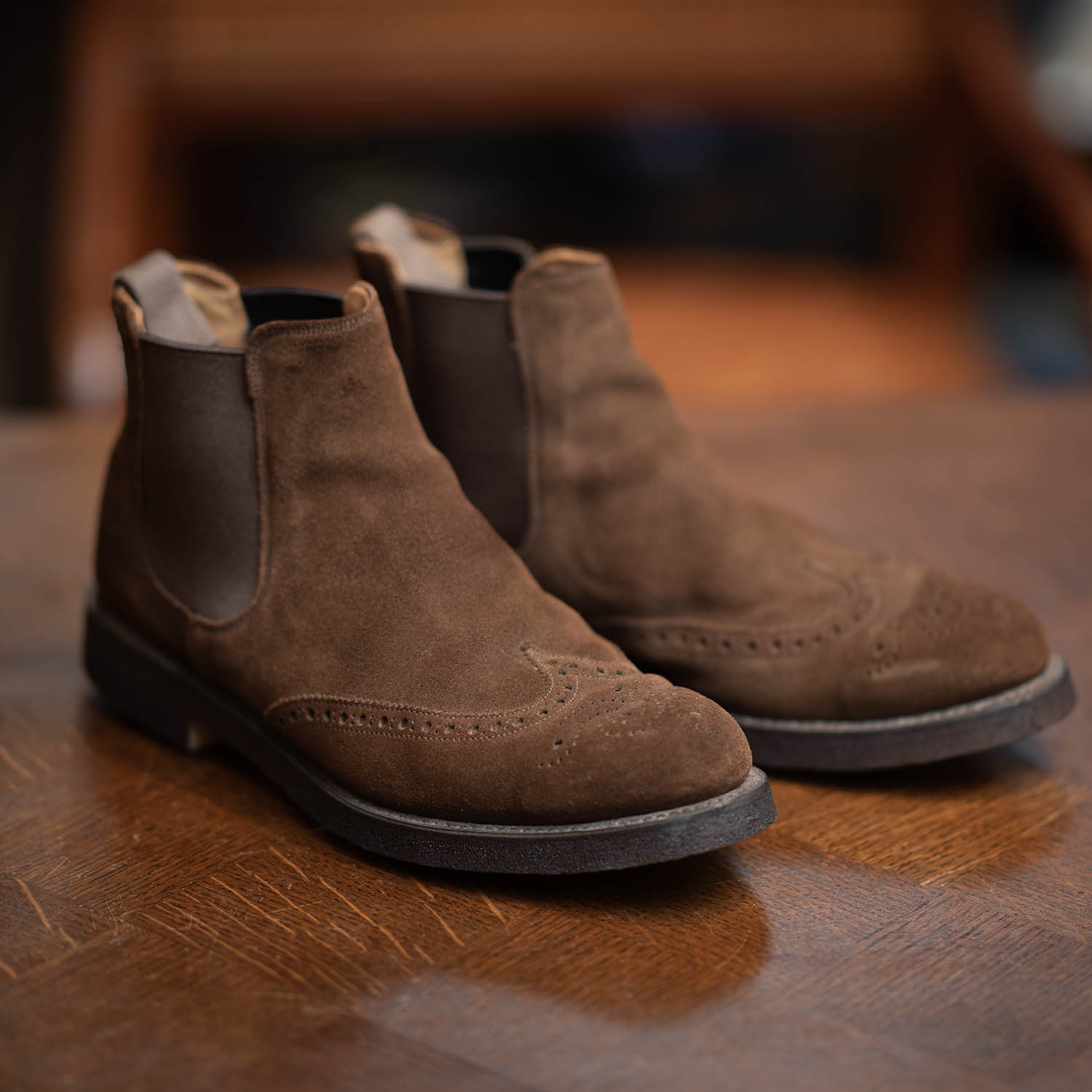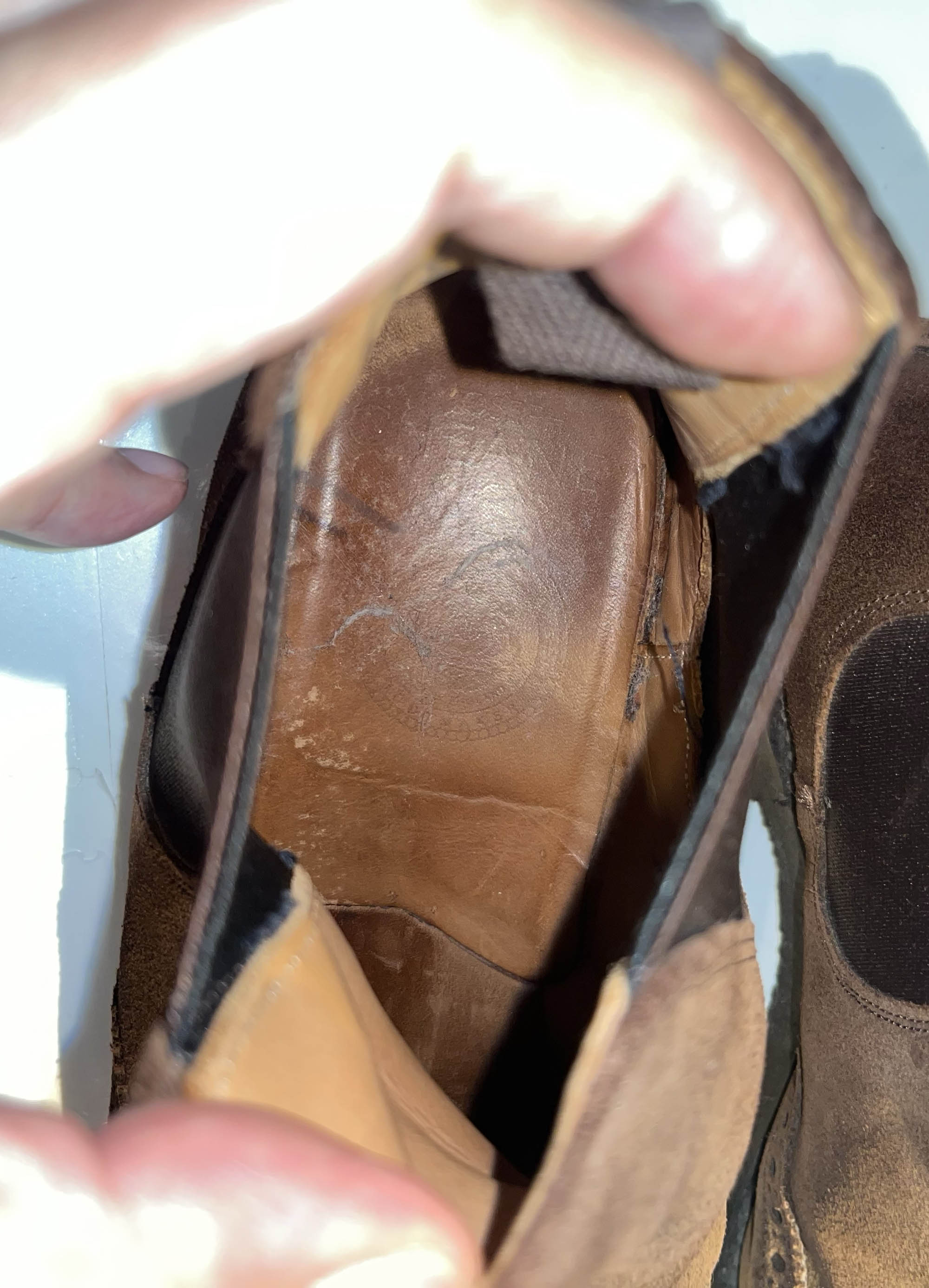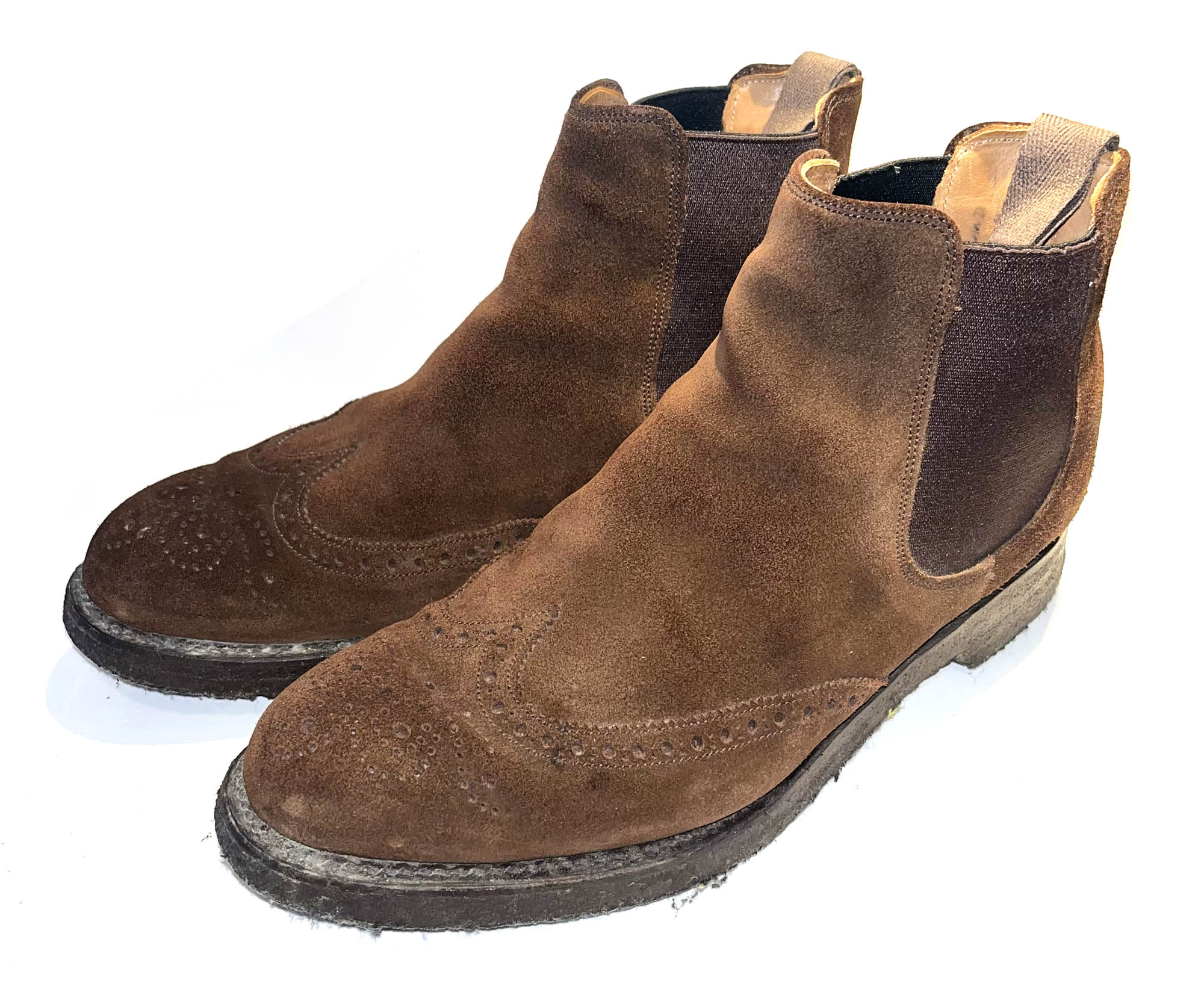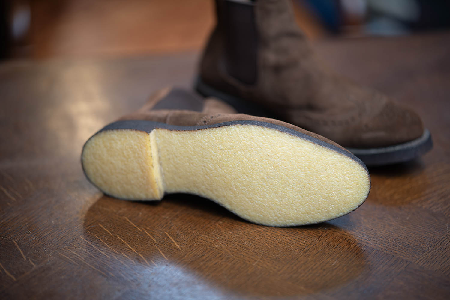 タフな英国靴ジョセフチーニーのチェルシーブーツ。当店で販売した靴ではありませんが、修理依頼がありました。ご希望箇所は、オールソール、インソックの交換です。インソックはロゴなしでもともとの形状に近づけて制作。ソールは、ホワイトのクレープソールで、コバ面は塗装済みです。パッと見は新品のように戻りました。