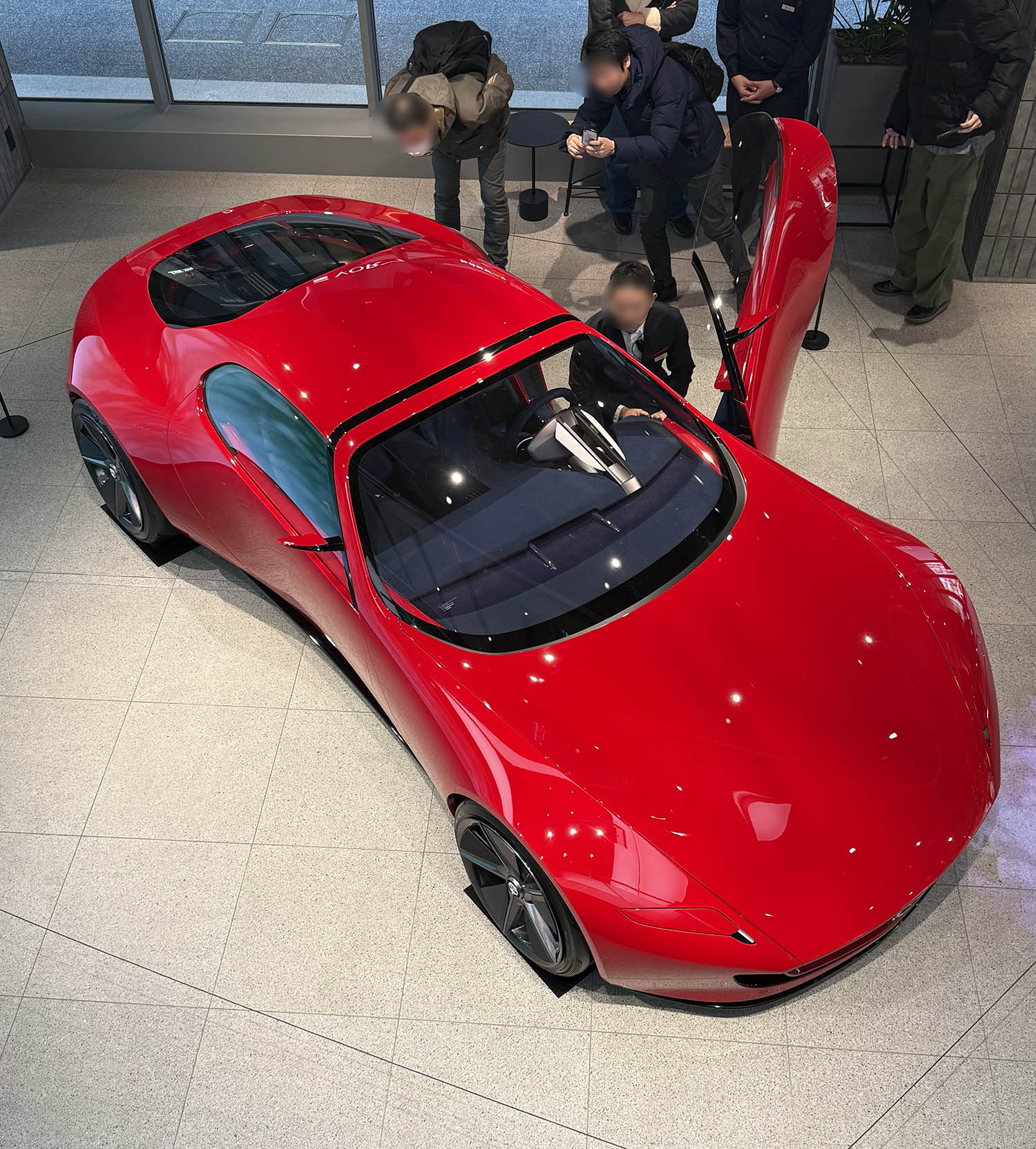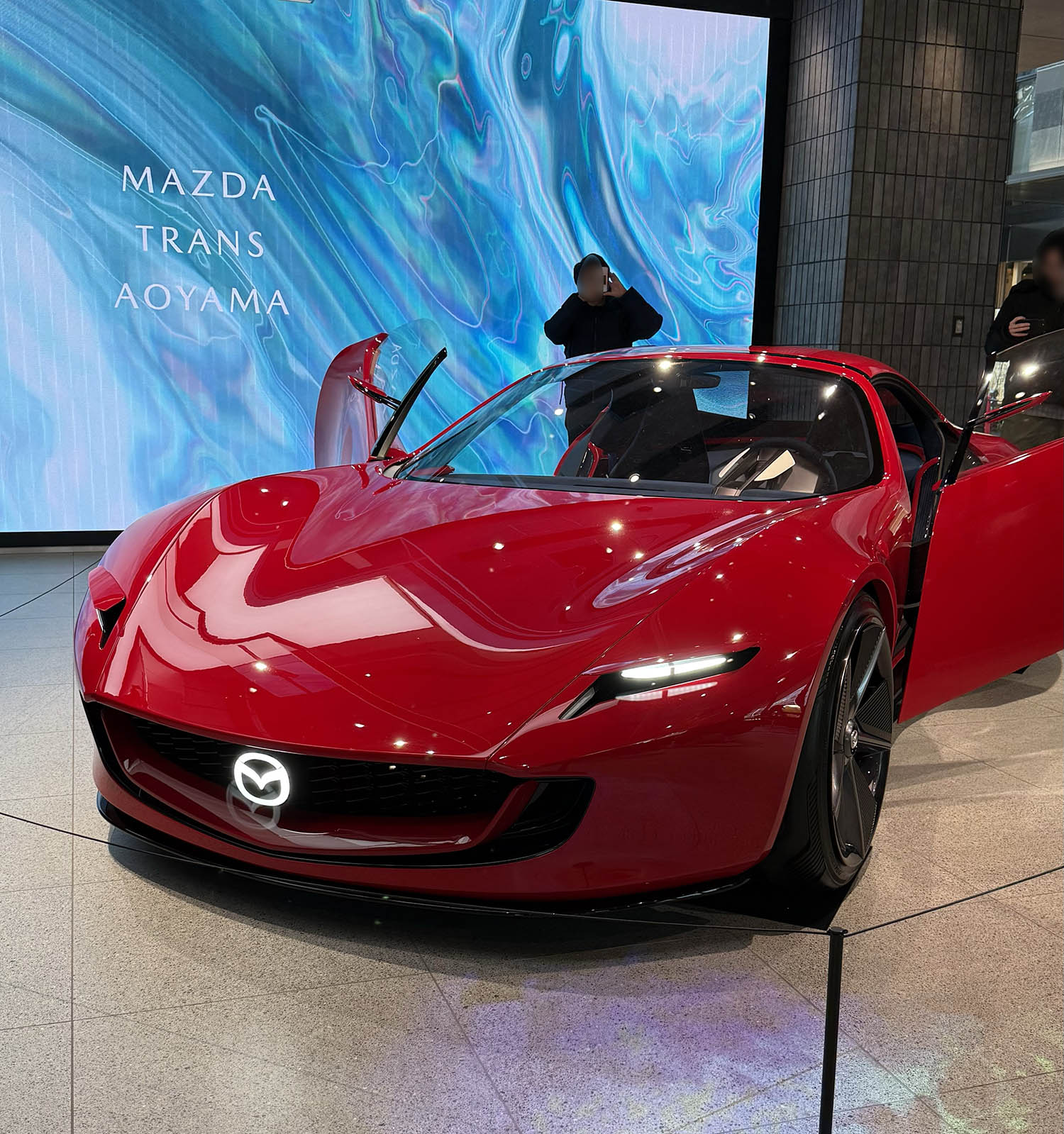 おおぉぉぉっ! これはマツダのコンセプトカーMAZDA ICONIC SPではありませんか。めっちゃ格好いいですね。美しい。やっぱりスポーツカーはいいですね。シザーズドアは、自動で開閉するようにできています。コンセプトとはいえすごい完成度。リトラクタブルのヘッドライトもマツダらしい。