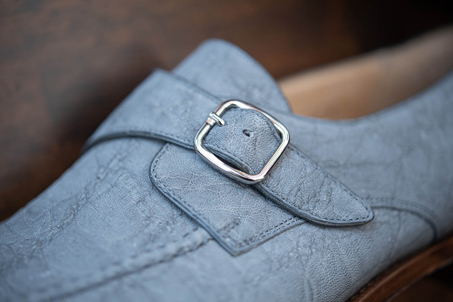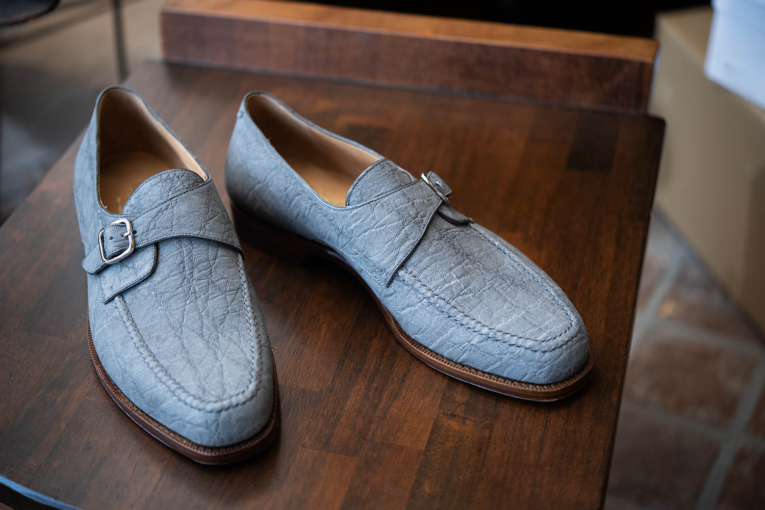 ジンバブエ産のエレファントレザーを採用し、個性的かつ存在感のある仕上がりとなっています。「JONATHAN」ラストは、セミスクエアのトゥノーズが特徴で、スッと伸びたアッパーが軽やかさとシャープな印象を演出します。足を包み込むフィット感は、締めつけすぎず、かといって緩すぎない、絶妙なバランスを追求しているのが分かります。