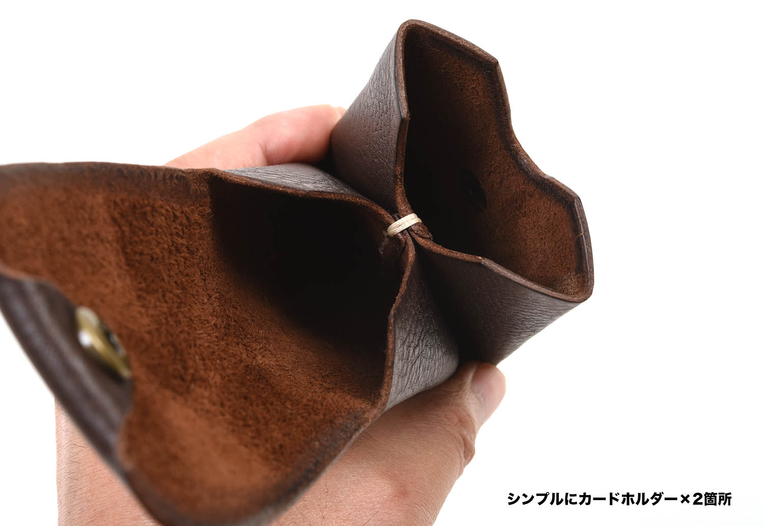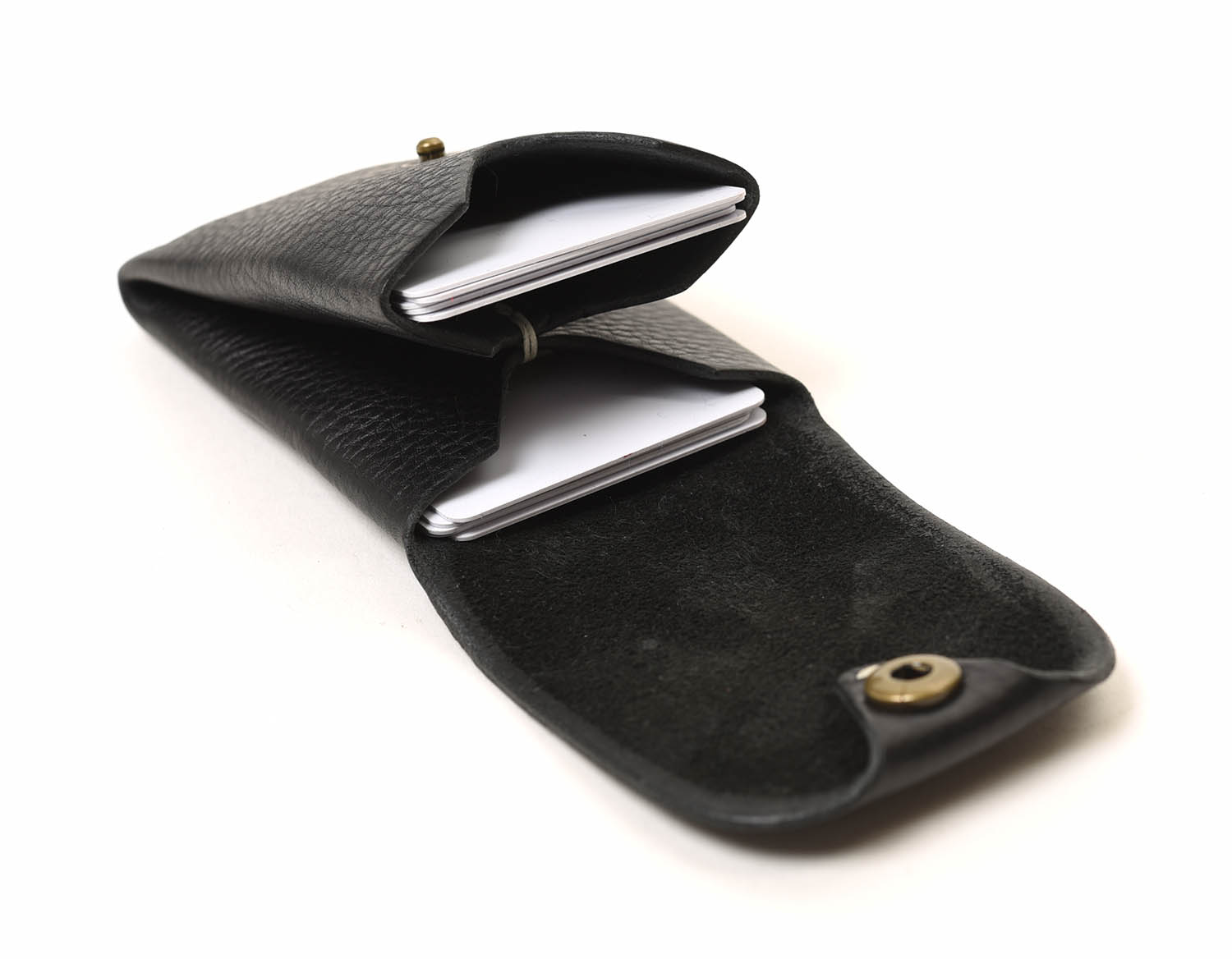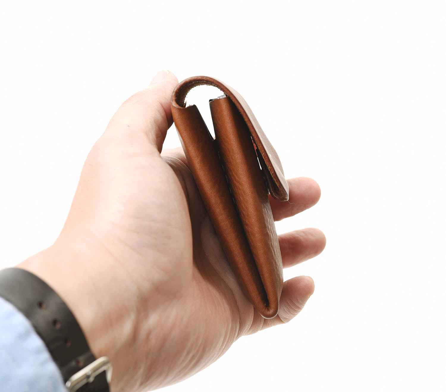 シンプルな折り紙スタイルのカードホルダー。1枚の革を極力縫わずに折り込んで構成し、手にすっと馴染むミニマルなフォルムです。内側は2層ポケット構造で、合計16〜18枚ほどのカードを収納可能(使い込むとさらに増えます)。