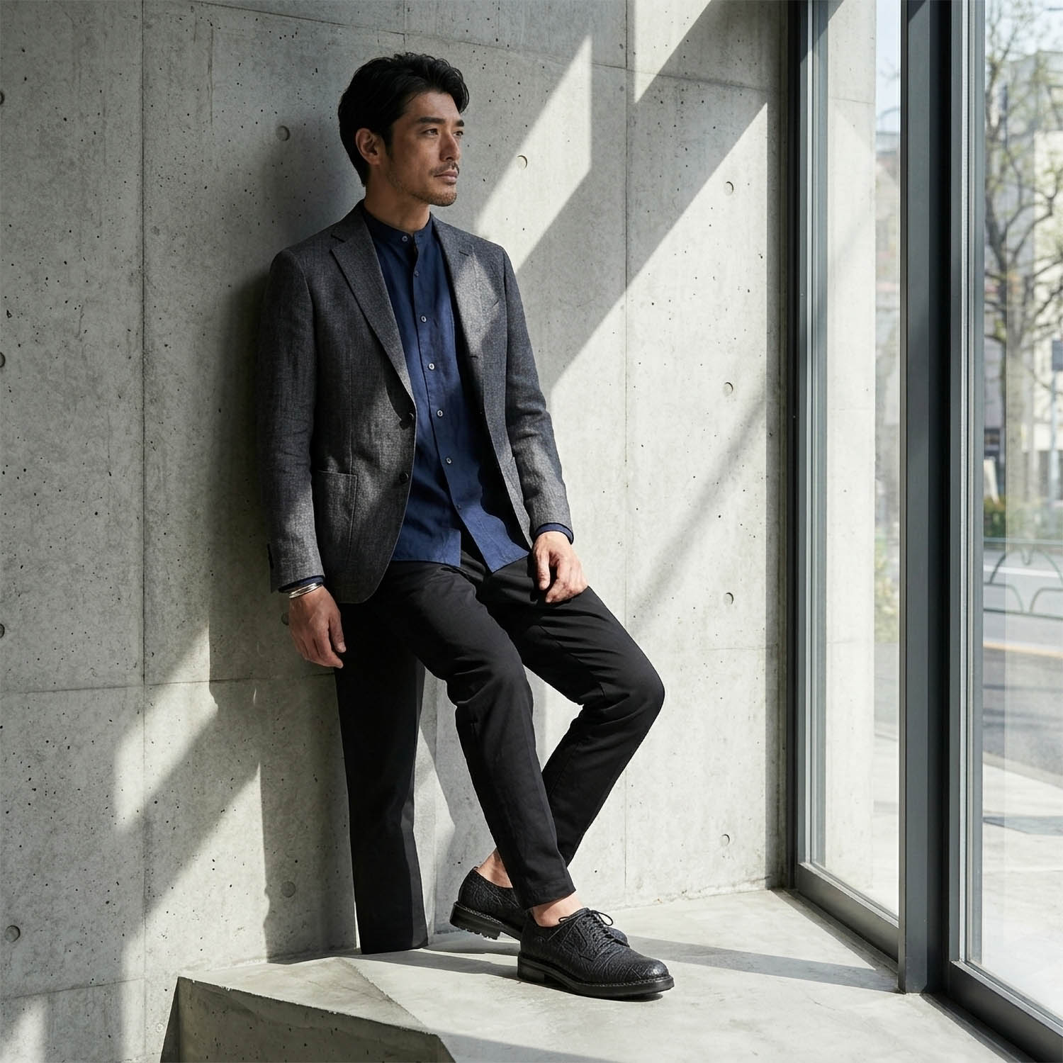 ジャケットスタイル、モノトーンコーデ、カジュアルなパンツスタイル。足元にこの靴を置くだけで、装い全体がぐっと引き締まる。そんな不思議な魅力を持つ一足です。こんな靴で仕事や出張できたら最高ですよね! そんな人生で行きましょう!