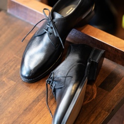 ユタカーフの端正な外羽根──F.lli Giacometti FG600-013 NERO 再入荷 最新木型「GRIGIA」採用の外羽根プレーントゥ 美しいオブリークトゥのシルエット端正なラストがもたらす快適な足入れ ソールの美しい仕上げとリフト感交差するマス目模様が魅せるユタカーフ イタリアの ...
